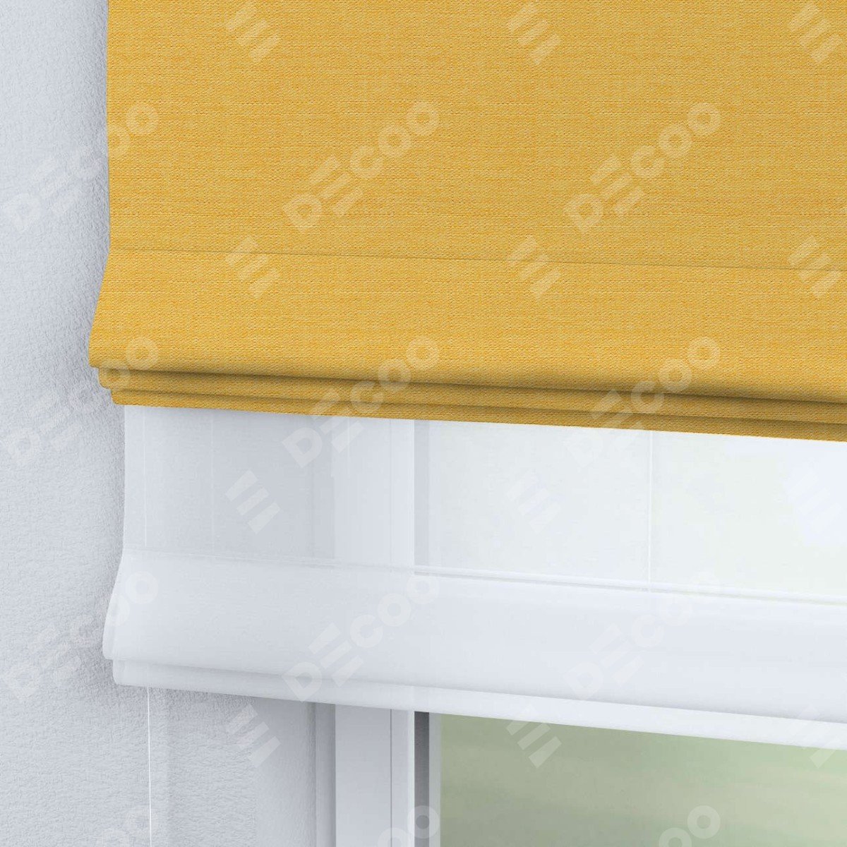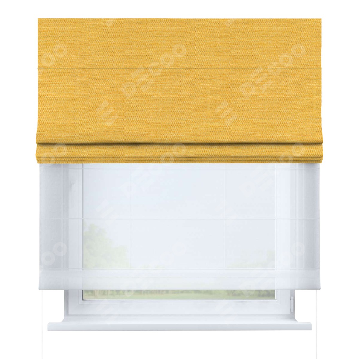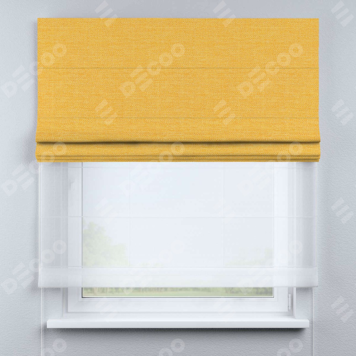 Римская штора день-ночь производителя «Cortin», используется для проёма, пошита из двух полотен, с лицевой стороны лён жёлтый артикул 63738, вторая ткань тюль (по стандарту комплектуется тюль белого цвета артикул V-01). Имеет универсальный механизм и подходит для монтажа: на потолок, на стену и в нишу.