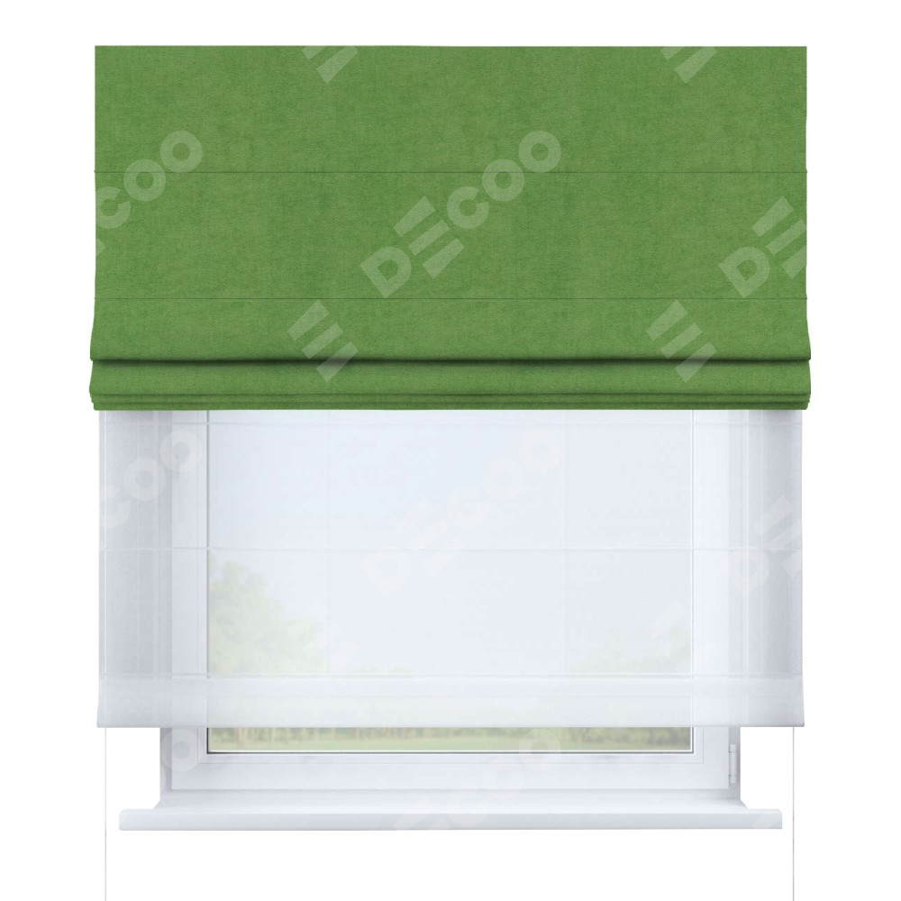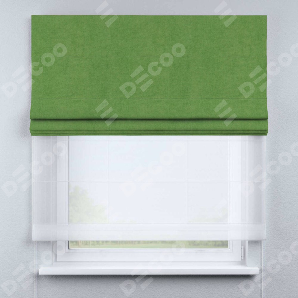 Римская штора день-ночь производителя «Cortin», используется для проёма, пошита из двух полотен, с лицевой стороны вельвет салатовый артикул 87072, вторая ткань тюль (по стандарту комплектуется тюль белого цвета артикул V-01). Имеет универсальный механизм и подходит для монтажа: на потолок, на стену и в нишу.