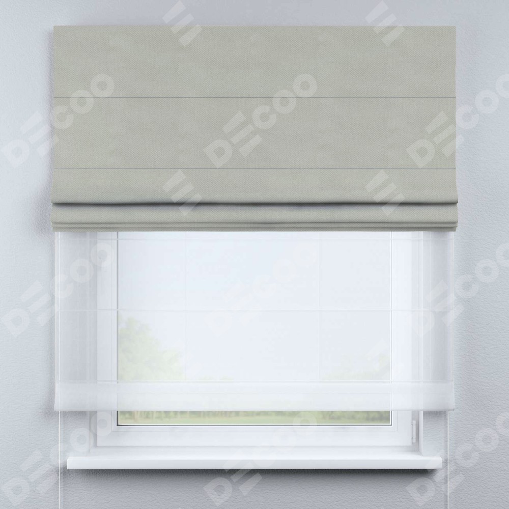 Римская штора день-ночь производителя «Cortin», используется для проёма, пошита из двух полотен, с лицевой стороны лён димаут светло-серый артикул 83025, вторая ткань тюль (по стандарту комплектуется тюль белого цвета артикул V-01). Имеет универсальный механизм и подходит для монтажа: на потолок, на стену и в нишу.