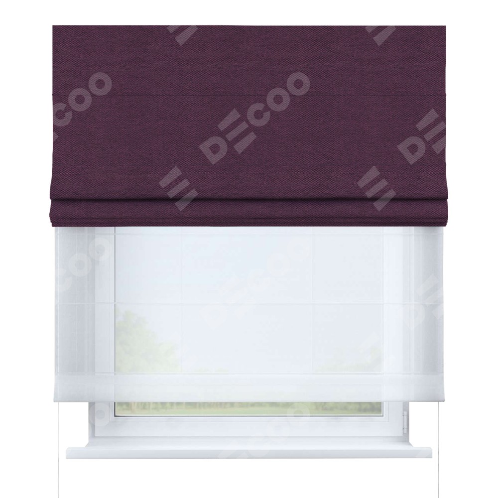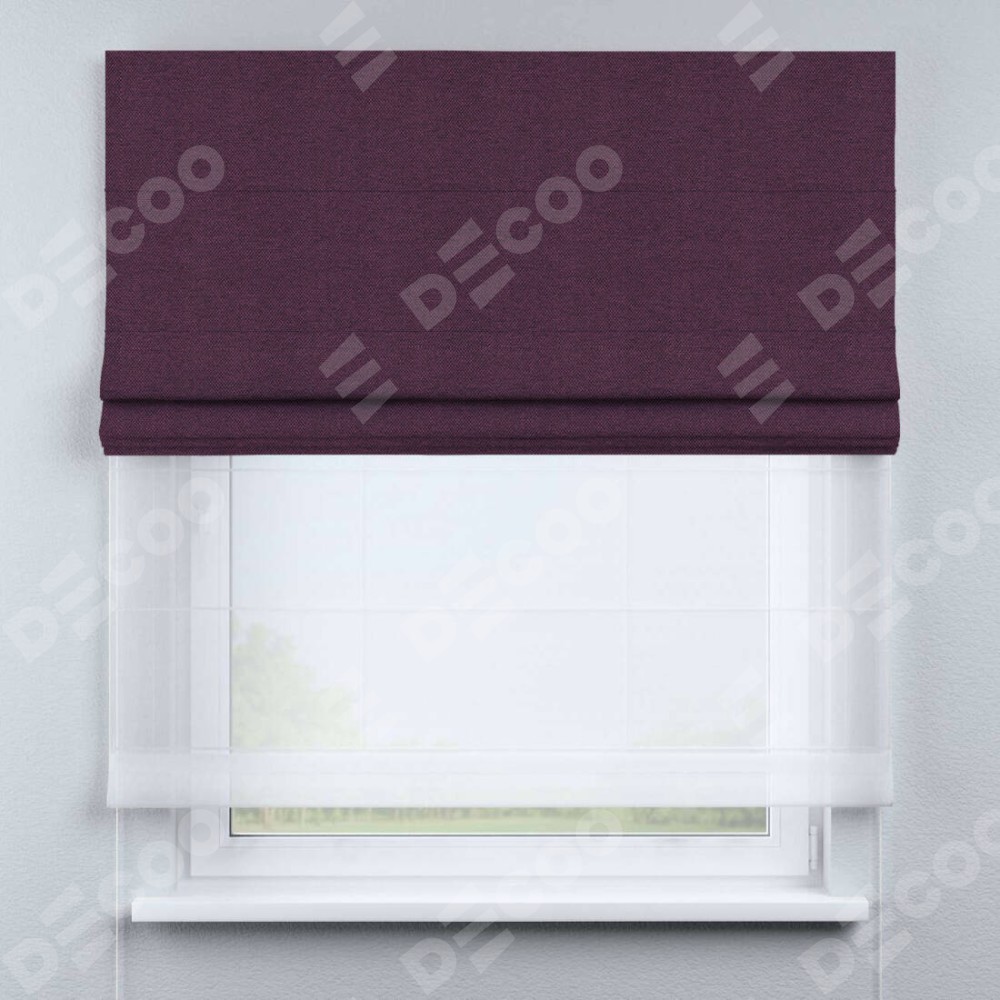Римская штора день-ночь производителя «Cortin», используется для проёма, пошита из двух полотен, с лицевой стороны лён димаут фиолетовый артикул 8817, вторая ткань тюль (по стандарту комплектуется тюль белого цвета артикул V-01). Имеет универсальный механизм и подходит для монтажа: на потолок, на стену и в нишу.