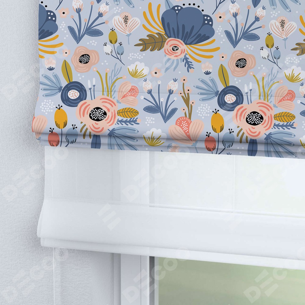 Римская штора день-ночь производителя «Cortin», используется для проёма, пошита из двух полотен, с лицевой блэкаут с нанесением сублимационной печати «Волшебные цветы», вторая ткань тюль (по стандарту комплектуется тюль белого цвета артикул V-01). Имеет универсальный механизм и подходит для монтажа: на потолок, на стену и в нишу.