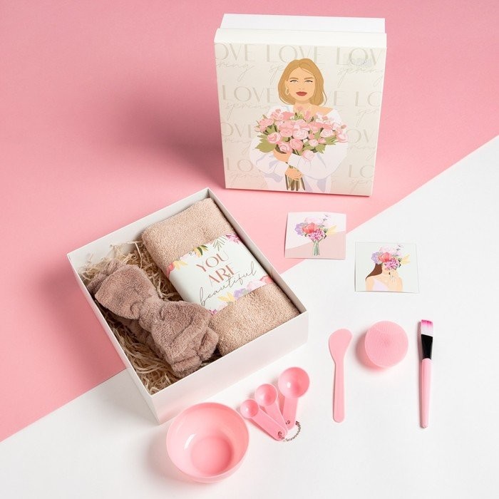 .Повязка, полотенце, спонж, миски, кисточка, лопатка, мерная ложечка, 2 открытки
