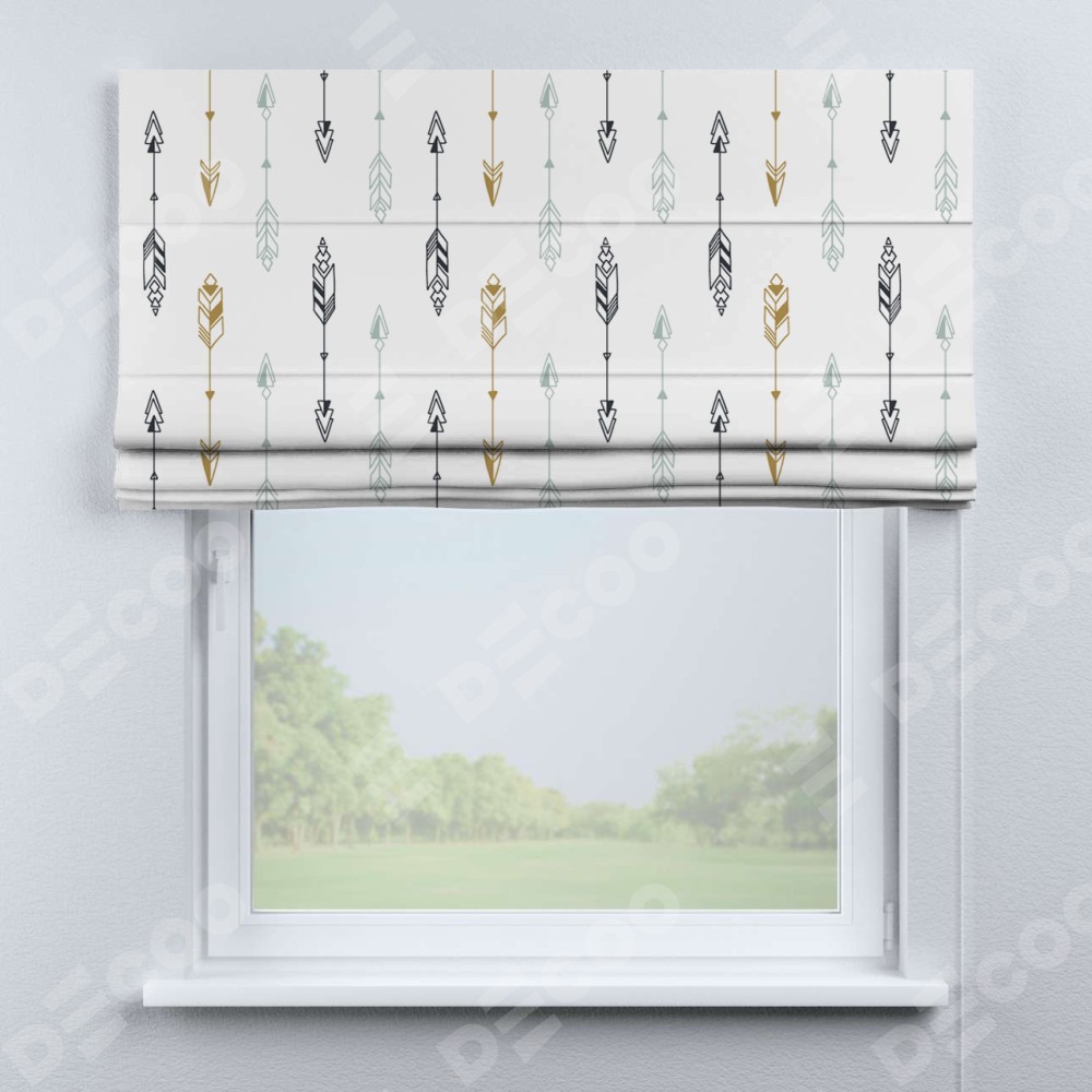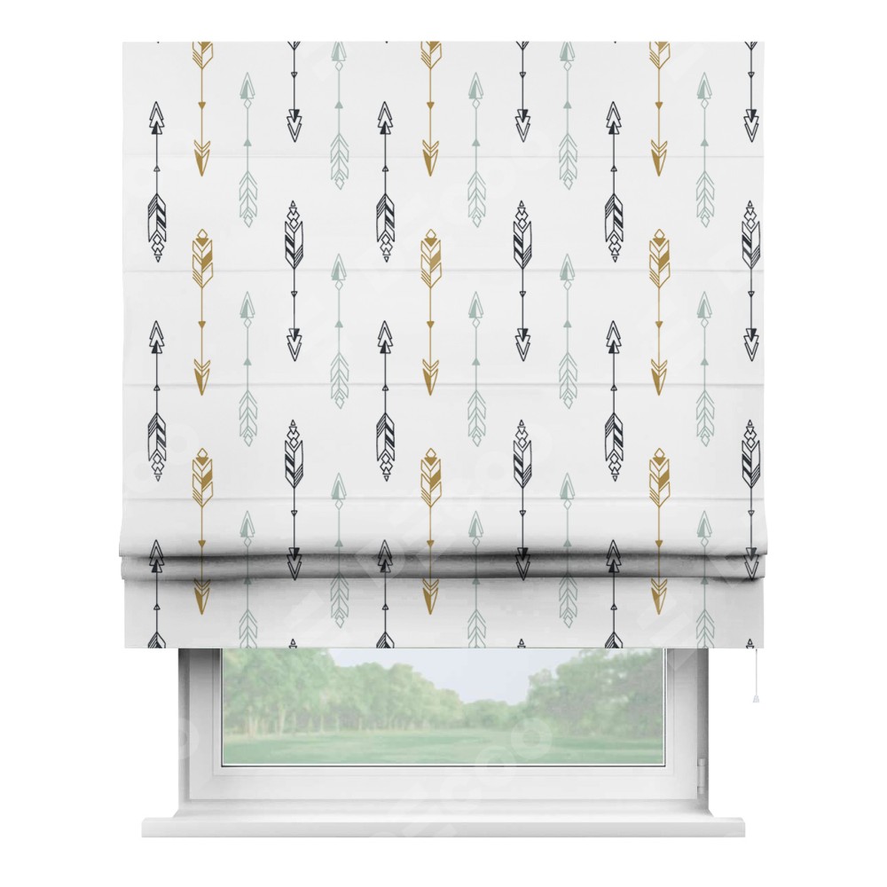Римская штора производителя «Cortin», используется для проёма, пошита из ткани блэкаут с нанесением сублимационной печати «Любимые стрелки». Имеет универсальный механизм и подходит для монтажа: на потолок, на стену и в нишу.