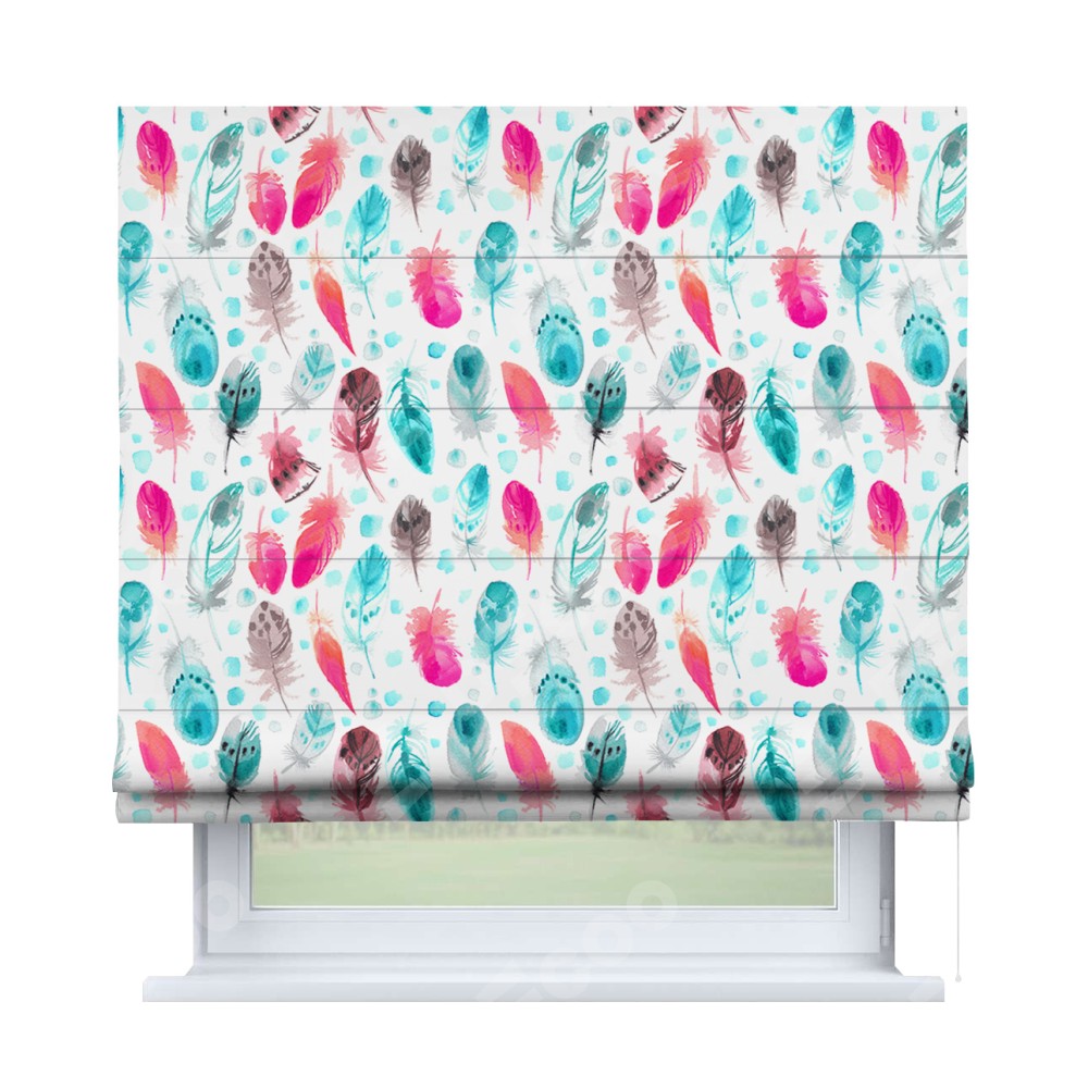 Римская штора производителя «Cortin», используется для проёма, пошита из ткани блэкаут с нанесением сублимационной печати «Перья». Имеет универсальный механизм и подходит для монтажа: на потолок, на стену и в нишу.