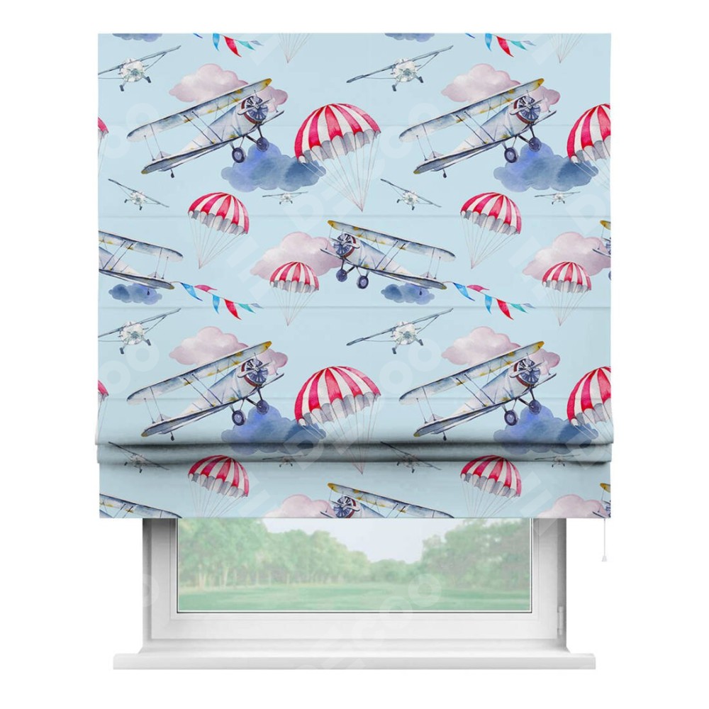 Римская штора производителя «Cortin», используется для проёма, пошита из ткани блэкаут с нанесением сублимационной печати «Самолёт». Имеет универсальный механизм и подходит для монтажа: на потолок, на стену и в нишу.