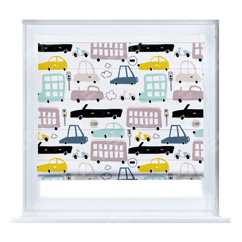 Римская штора кассетного типа, производителя «Cortin», устанавливается только на пластиковые окна и прилегает к стеклопакету, пошита из ткани блэкаут с нанесением сублимационной печати «Красочный трафик».