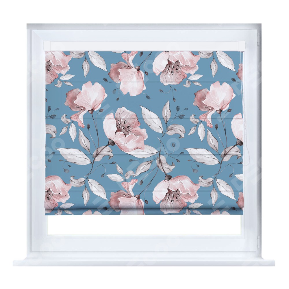 Римская штора кассетного типа, производителя «Cortin», устанавливается только на пластиковые окна и прилегает к стеклопакету, пошита из ткани блэкаут с нанесением сублимационной печати «Розовая лагуна».