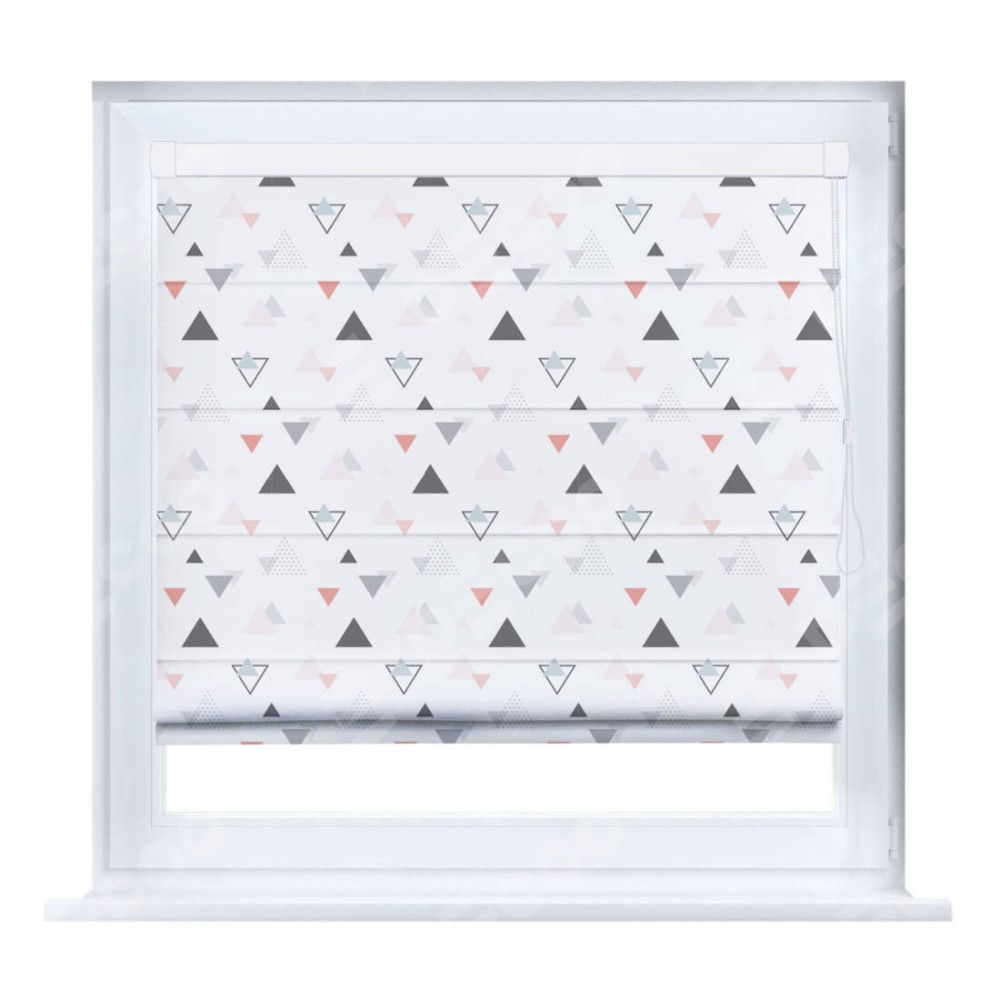 Римская штора производителя «Cortin», устанавливается на створку окна, пошита из ткани блэкаут с нанесением сублимационной печати «Дождь из треугольников». Штора шьётся по индивидуальным размерам, для данного типа римской шторы возможная ширина от 35 до 150 см., высота до 250 см.