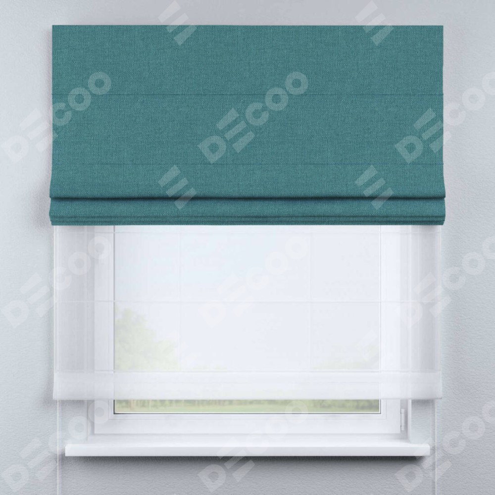 Римская штора день-ночь производителя «Cortin», используется для проёма, пошита из двух полотен, с лицевой стороны лён бирюзовый артикул 53436, вторая ткань тюль (по стандарту комплектуется тюль белого цвета артикул V-01). Имеет универсальный механизм и подходит для монтажа: на потолок, на стену и в нишу.