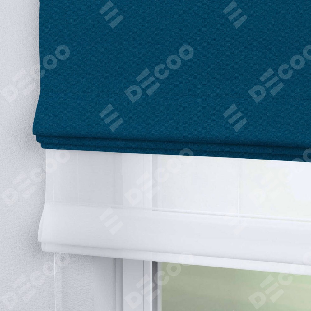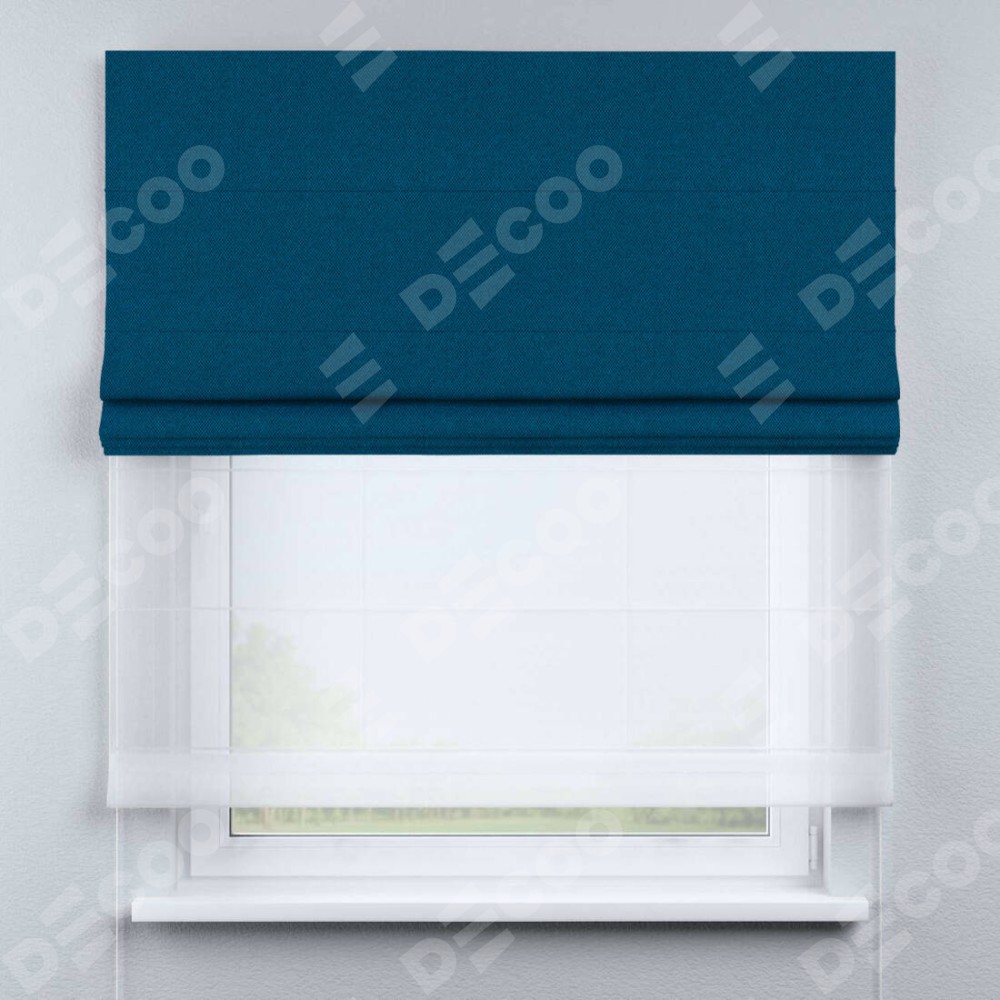 Римская штора день-ночь производителя «Cortin», используется для проёма, пошита из двух полотен, с лицевой стороны лён димаут синий артикул 16260, вторая ткань тюль (по стандарту комплектуется тюль белого цвета артикул V-01). Имеет универсальный механизм и подходит для монтажа: на потолок, на стену и в нишу.