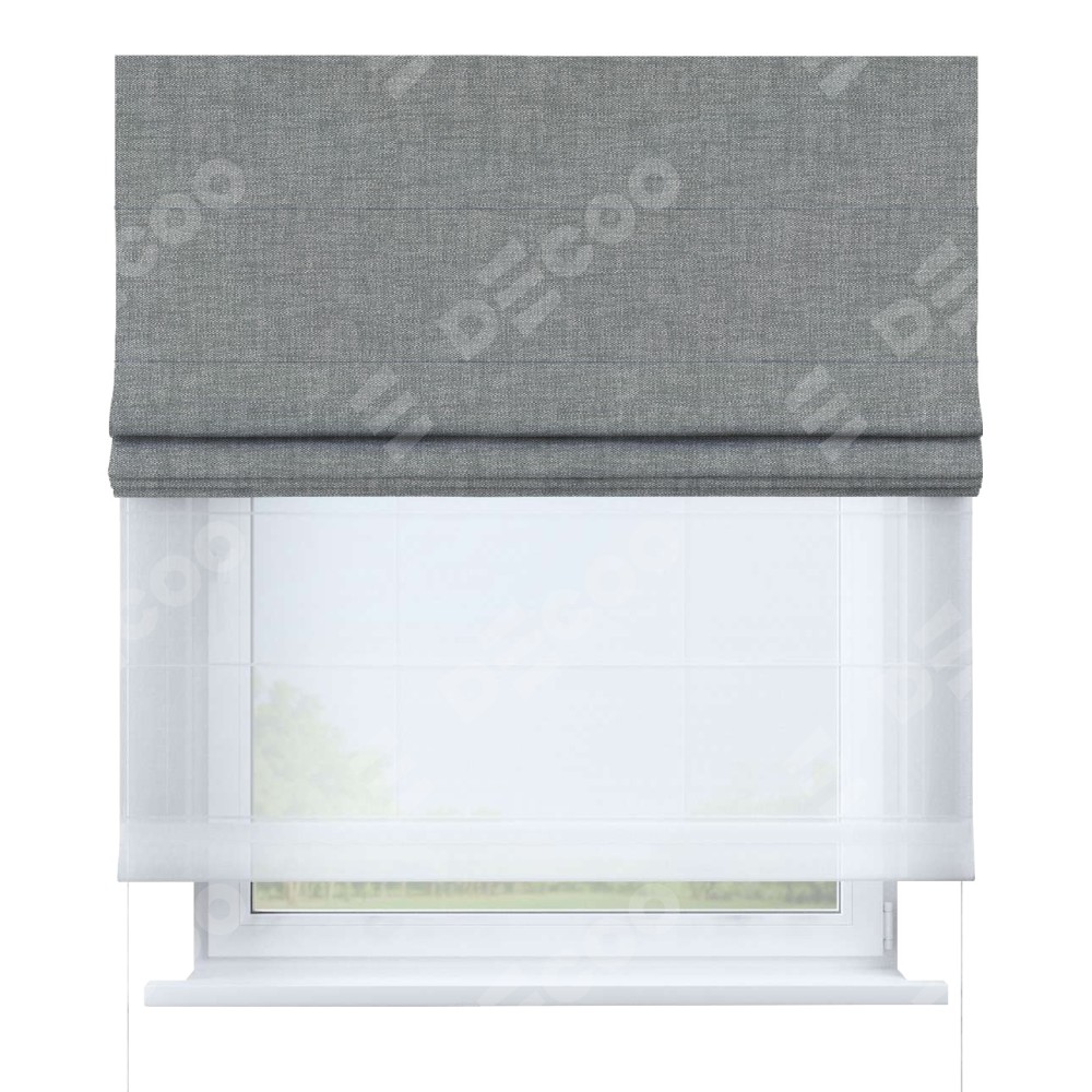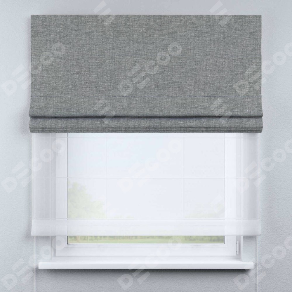 Римская штора день-ночь производителя «Cortin», используется для проёма, пошита из двух полотен, с лицевой стороны рогожка димаут тёмно-серый артикул 80418, вторая ткань тюль (по стандарту комплектуется тюль белого цвета артикул V-01). Имеет универсальный механизм и подходит для монтажа: на потолок, на стену и в нишу.