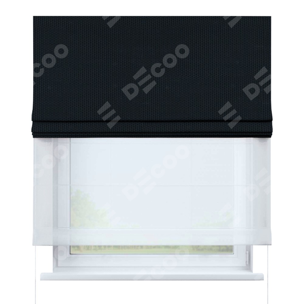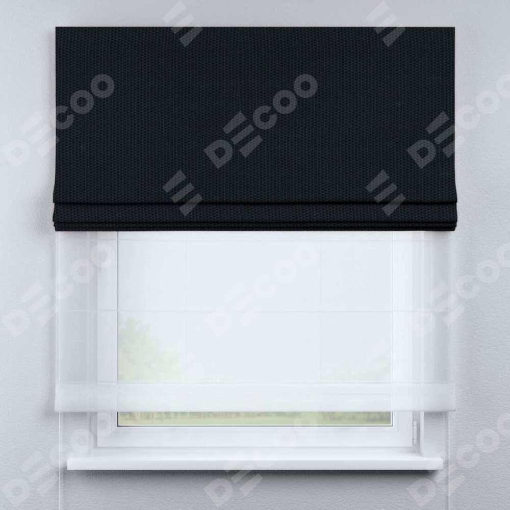 Римская штора день-ночь производителя «Cortin», используется для проёма, пошита из двух полотен, с лицевой стороны лён димаут max синий артикул 75576, вторая ткань тюль (по стандарту комплектуется тюль белого цвета артикул V-01). Имеет универсальный механизм и подходит для монтажа: на потолок, на стену и в нишу.
