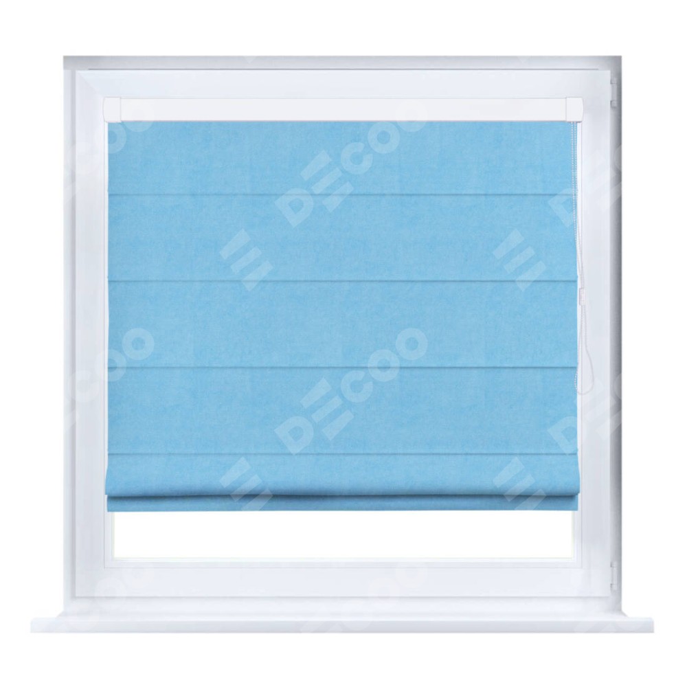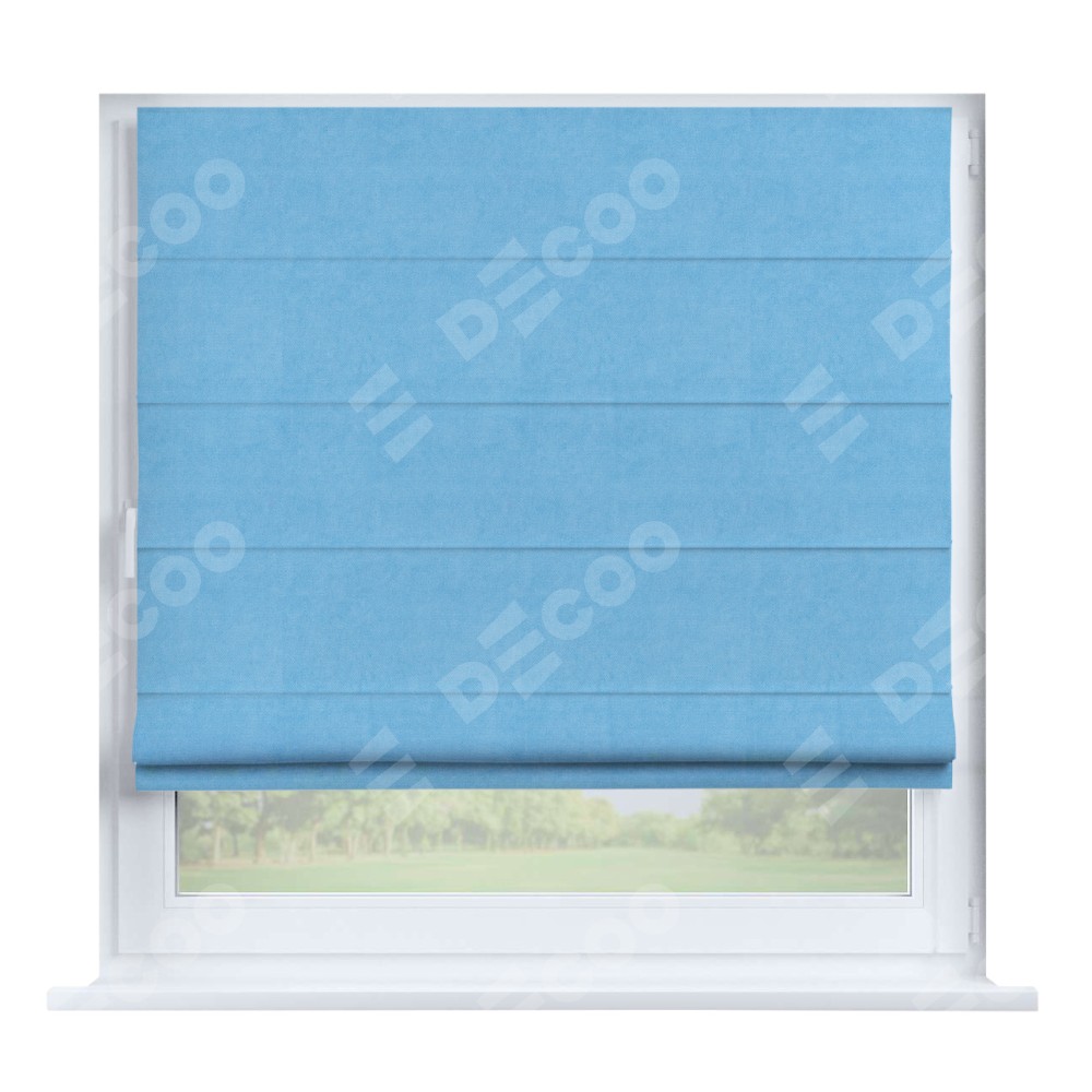 Римская штора производителя «Cortin», устанавливается на створку окна, пошита из ткани вельвет голубой, артикул 85544. Штора шьётся по индивидуальным размерам, для данного типа римской шторы возможная ширина от 35 до 150 см., высота до 250 см.