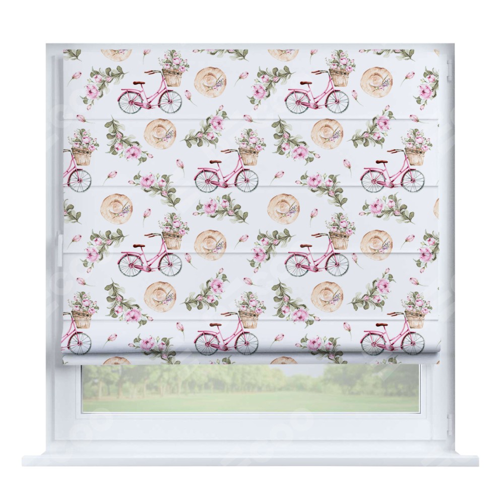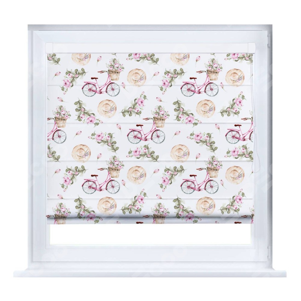 Римская штора производителя «Cortin», устанавливается на створку окна, пошита из ткани блэкаут с нанесением сублимационной печати «Розовый велосипед». Штора шьётся по индивидуальным размерам, для данного типа римской шторы возможная ширина от 35 до 150 см., высота до 250 см.
