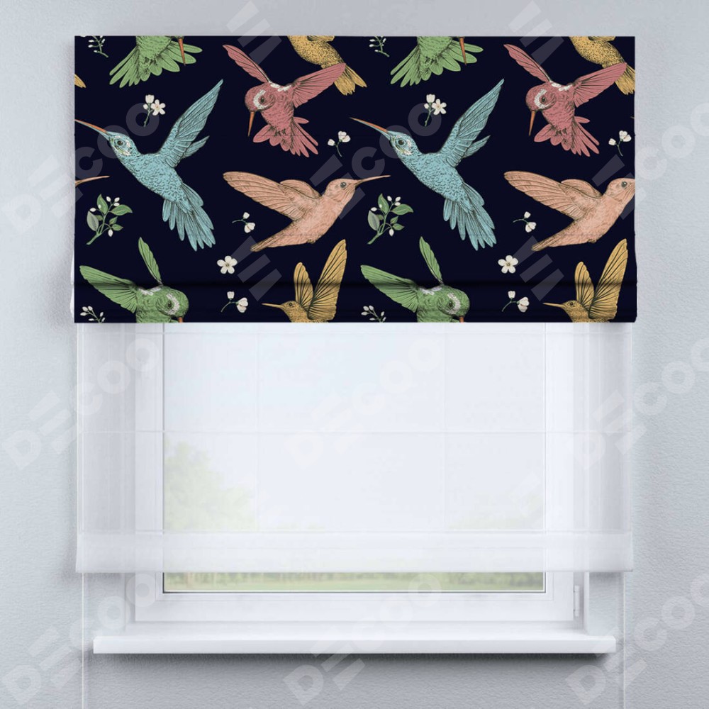 Римская штора день-ночь производителя «Cortin», используется для проёма, пошита из двух полотен, с лицевой блэкаут с нанесением сублимационной печати «Птицы и цветы», вторая ткань тюль (по стандарту комплектуется тюль белого цвета артикул V-01). Имеет универсальный механизм и подходит для монтажа: на потолок, на стену и в нишу.