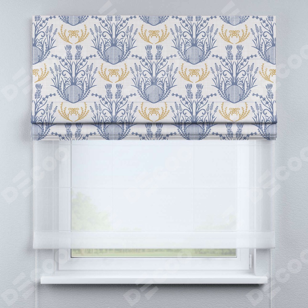 Римская штора день-ночь производителя «Cortin», используется для проёма, пошита из двух полотен, с лицевой блэкаут с нанесением сублимационной печати «Шикарная лаванда», вторая ткань тюль (по стандарту комплектуется тюль белого цвета артикул V-01). Имеет универсальный механизм и подходит для монтажа: на потолок, на стену и в нишу.