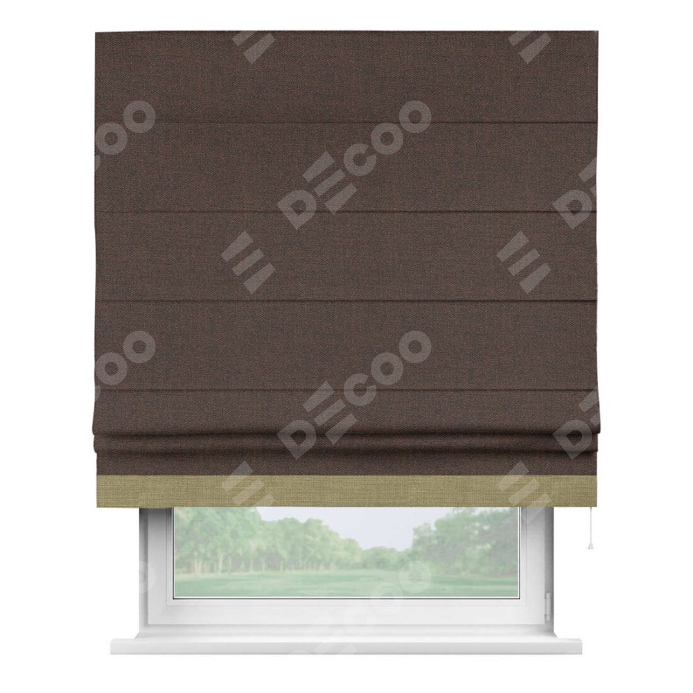 Римская штора производителя «Cortin», используется для проёма, пошита из ткани лён коричневый, артикул 53443. Отделка шторы кантом «Джестер», ткань для канта используется из льна разной расцветки на выбор. Имеет универсальный механизм и подходит для монтажа: на потолок, на стену и в нишу.