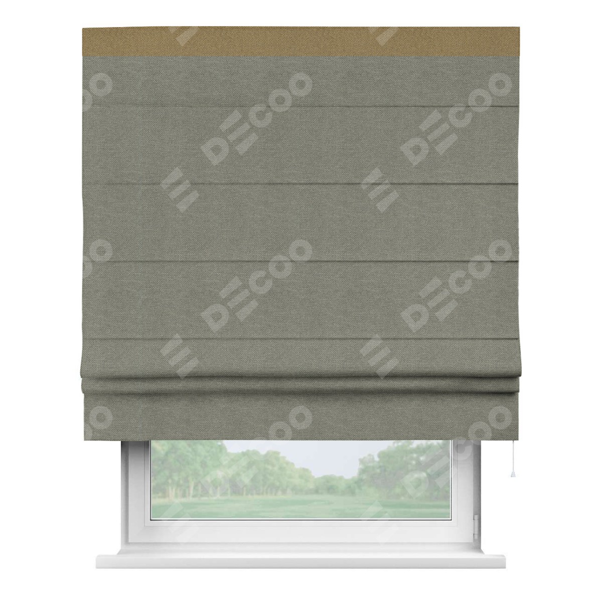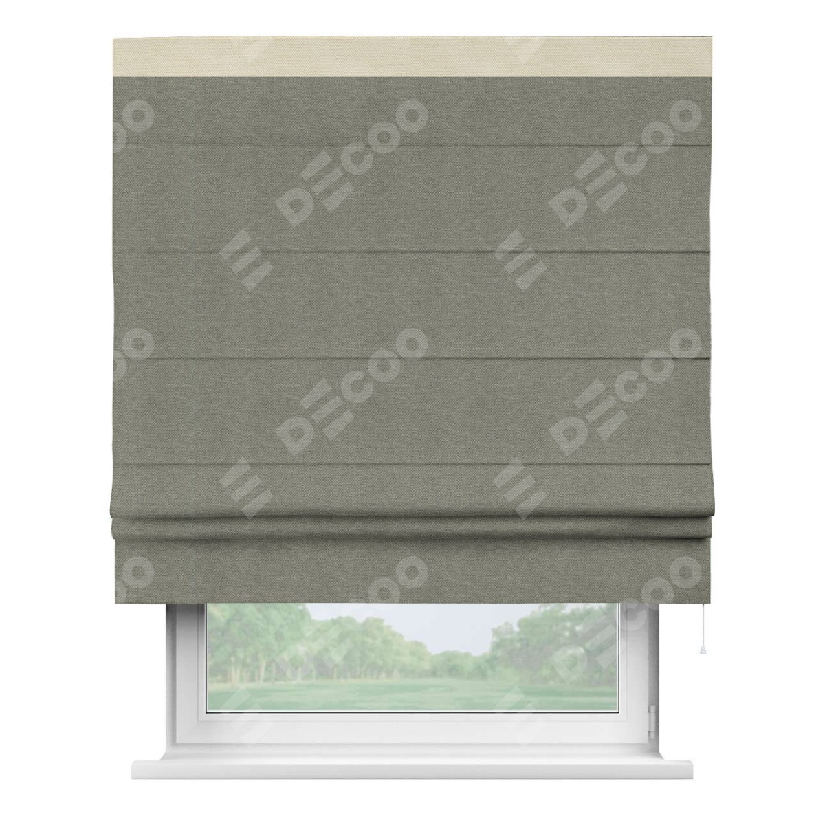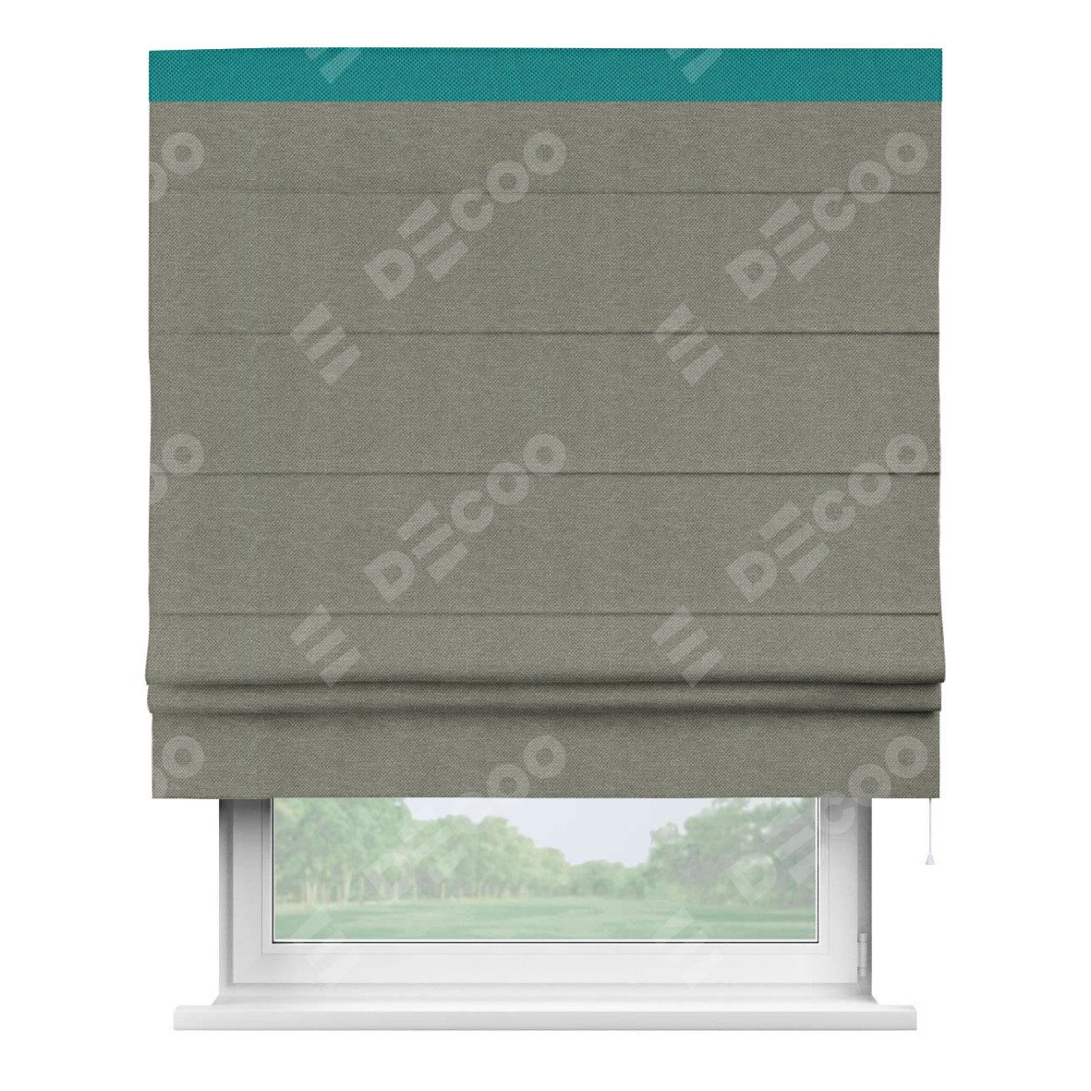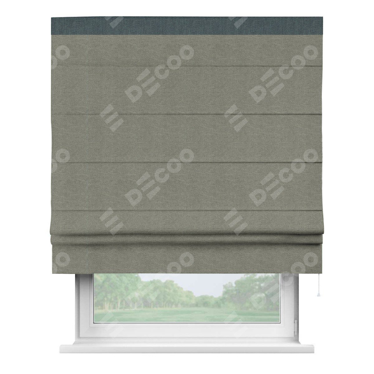 Римская штора производителя «Cortin», используется для проёма, пошита из ткани лён димаут стальной, артикул 25. Отделка шторы кантом «Кинг», ткань для канта используется из льна димаут разной расцветки на выбор. Имеет универсальный механизм и подходит для монтажа: на потолок, на стену и в нишу.