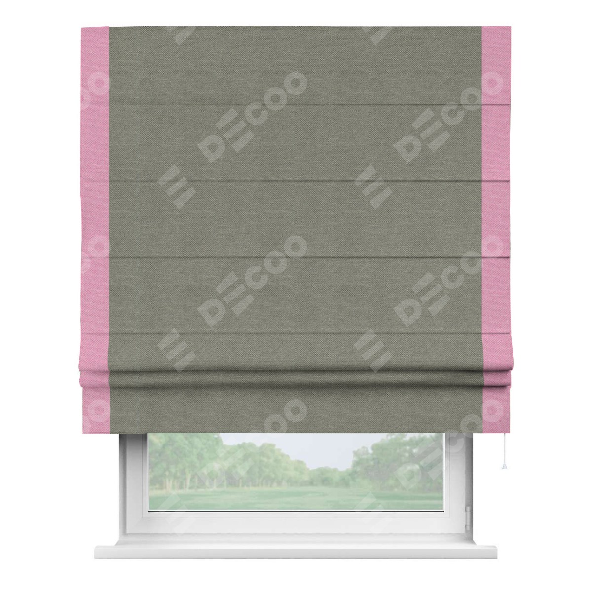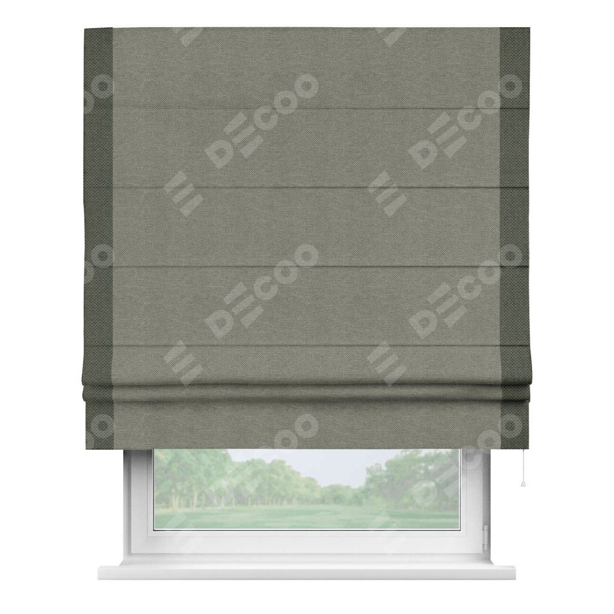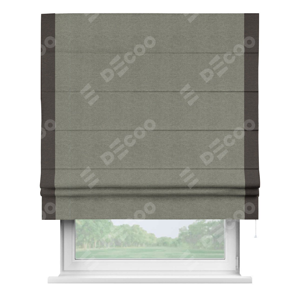 Римская штора производителя «Cortin», используется для проёма, пошита из ткани лён димаут стальной, артикул 25. Отделка шторы кантом «Стрим Дуо», ткань для канта используется из льна димаут разной расцветки на выбор. Имеет универсальный механизм и подходит для монтажа: на потолок, на стену и в нишу.