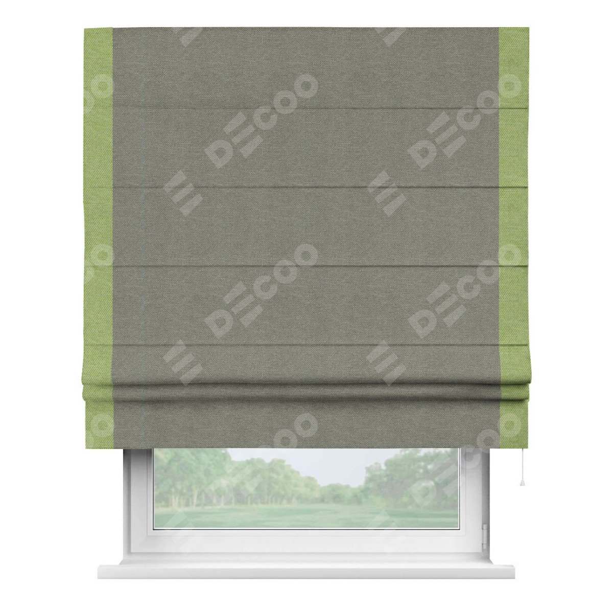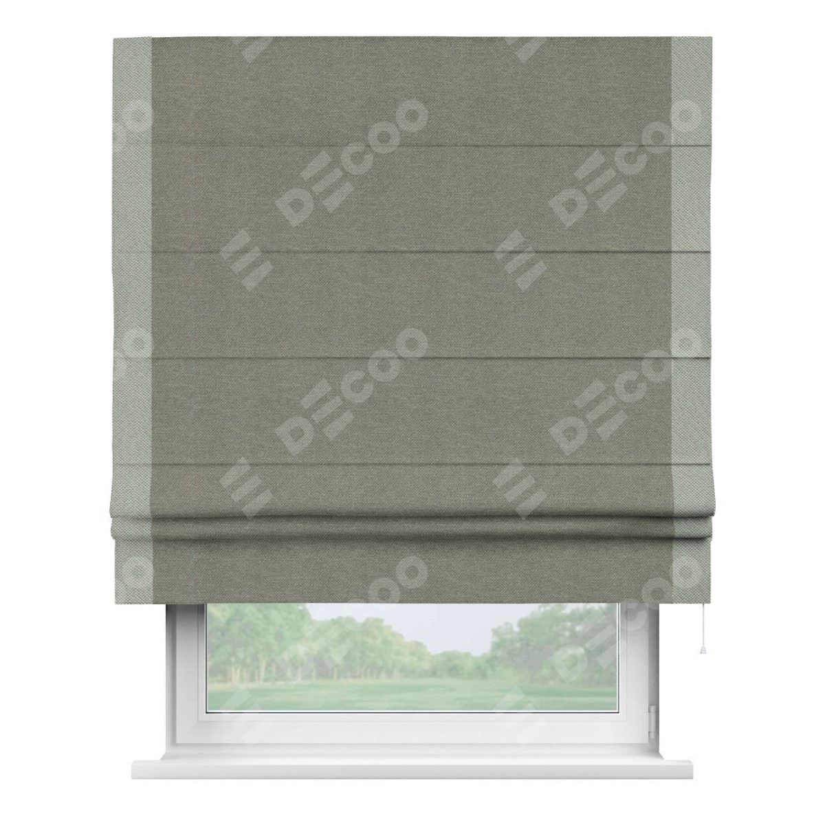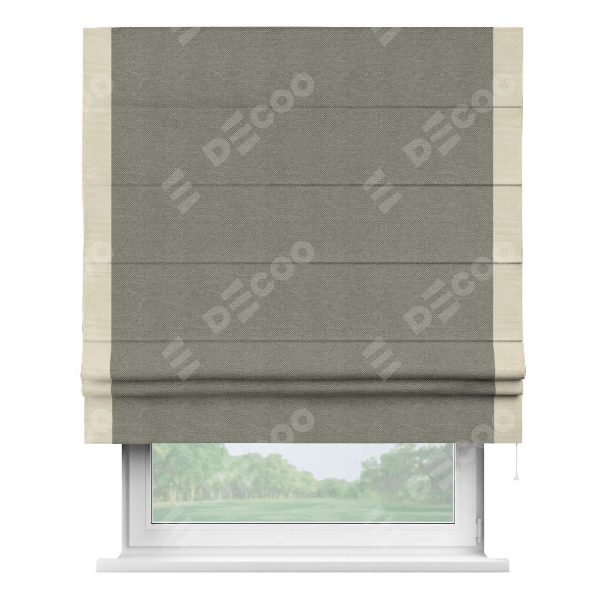 Римская штора производителя «Cortin», используется для проёма, пошита из ткани лён димаут стальной, артикул 25. Отделка шторы кантом «Стрим Дуо», ткань для канта используется из льна димаут разной расцветки на выбор. Имеет универсальный механизм и подходит для монтажа: на потолок, на стену и в нишу.