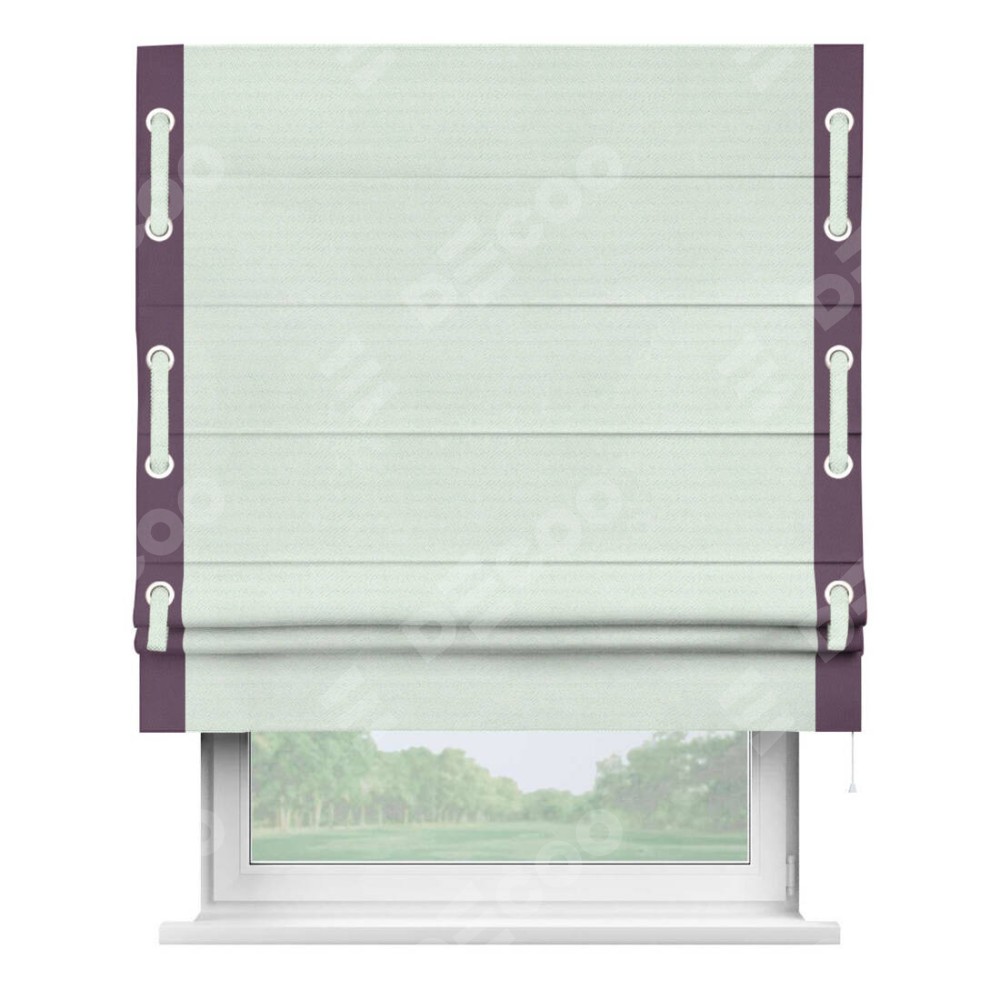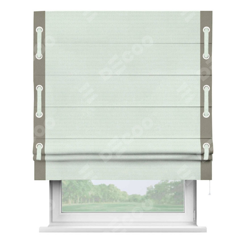 Римская штора производителя «Cortin», используется для проёма, пошита из ткани блэкаут однотонный дымчато-молочный, артикул ткани 88282. Отделка шторы кантом «Стрим Дуо» на кантах расположены люверсы с пояском, ткань для канта используется из блэкаута однотонного разной расцветки на выбор. Ткань для пояска обычно используется из основной ткани шторы, а так же можно сделать из любой расцветки по желанию. Имеет универсальный механизм и подходит для монтажа: на потолок, на стену и в нишу.