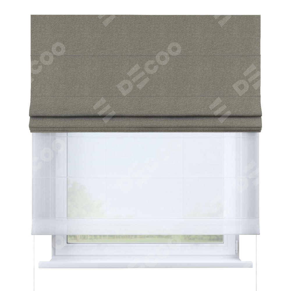 Римская штора день-ночь производителя «Cortin», используется для проёма, пошита из двух полотен, с лицевой стороны лён димаут серо-зелёный артикул 00003, вторая ткань тюль (по стандарту комплектуется тюль белого цвета артикул V-01). Имеет универсальный механизм и подходит для монтажа: на потолок, на стену и в нишу.