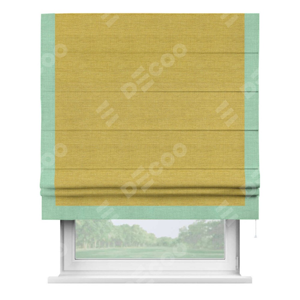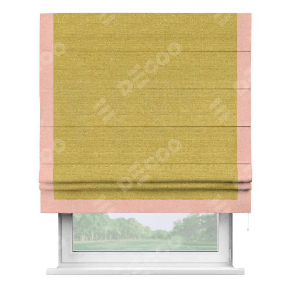 Римская штора производителя «Cortin», используется для проёма, пошита из ткани лён светло-салатовый, артикул 53438. Отделка шторы кантом «Виктория», ткань для канта используется из льна разной расцветки на выбор. Имеет универсальный механизм и подходит для монтажа: на потолок, на стену и в нишу.