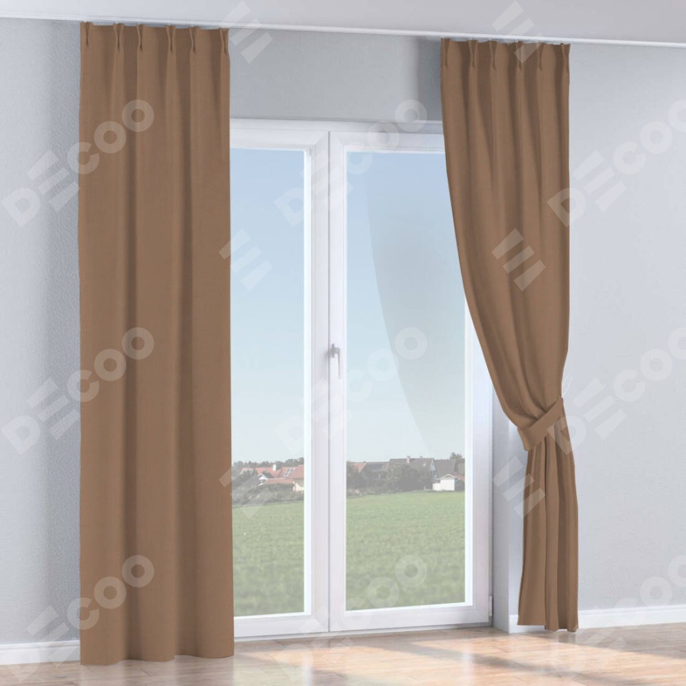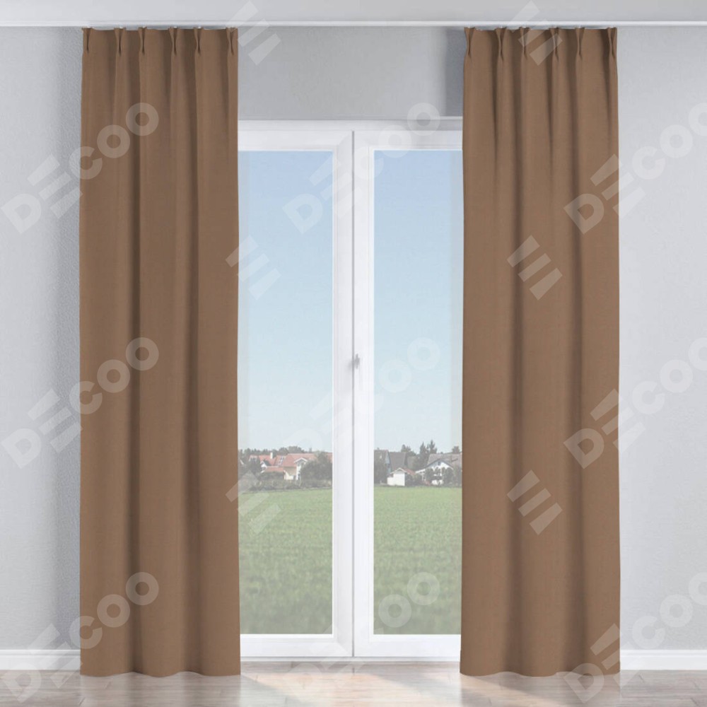 Комплект прямых штор, от производителя «Cortin», пошиты из ткани блэкаут однотонный коричневый, артикул ткани 88285. С изнаночной стороны в верхней части штор пристрачивается шторная лента с декоративными складками «Кустик». Для создания элегантных складок прямые шторы шьются по стандарту с коэффициентом 1:2 (на 100 см. ширины проёма 200 см. ширины ткани).