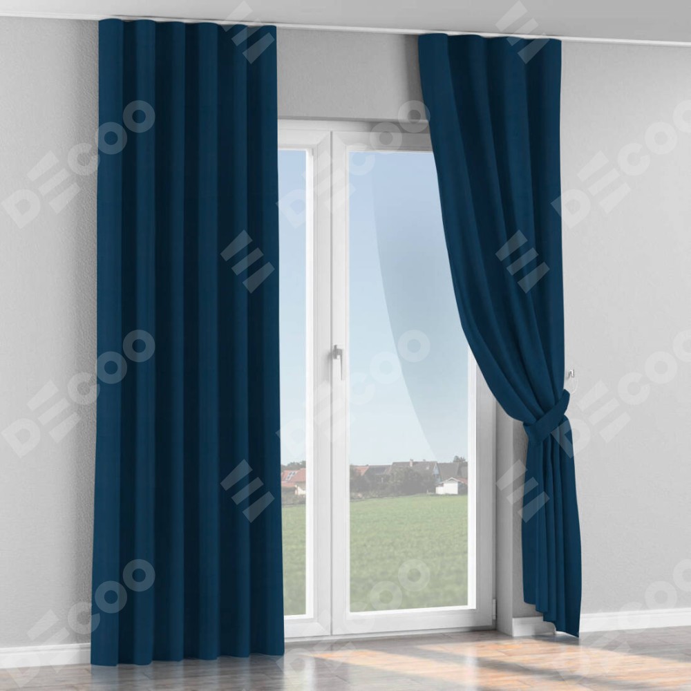 Комплект прямых штор, от производителя «Cortin», пошиты из ткани блэкаут однотонный синий, артикул ткани 29327. С изнаночной стороны в верхней части штор пристрачивается шторная лента с декоративными складками «Волна». Для создания элегантных складок прямые шторы шьются по стандарту с коэффициентом 1:2 (на 100 см. ширины проёма 200 см. ширины ткани).