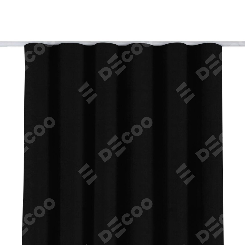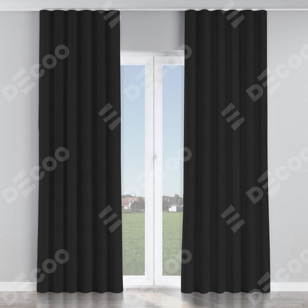 Комплект прямых штор, от производителя «Cortin», пошиты из ткани блэкаут однотонный черный, артикул ткани 79904. С изнаночной стороны в верхней части штор пристрачивается шторная лента с декоративными складками «Волна». Для создания элегантных складок прямые шторы шьются по стандарту с коэффициентом 1:2 (на 100 см. ширины проёма 200 см. ширины ткани).