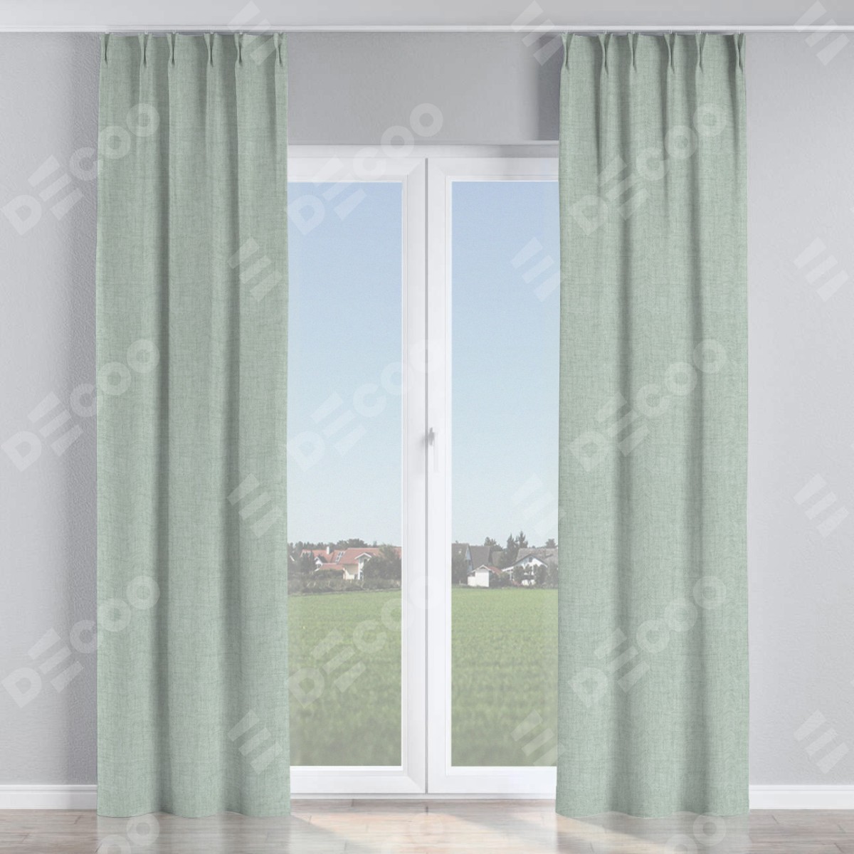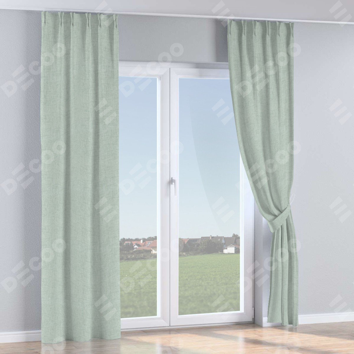 Комплект прямых штор, от производителя «Cortin», пошиты из ткани рогожка димаут серый, артикул ткани 80426. С изнаночной стороны в верхней части штор пристрачивается шторная лента с декоративными складками «Кустик». Для создания элегантных складок прямые шторы шьются по стандарту с коэффициентом 1:2 (на 100 см. ширины проёма 200 см. ширины ткани).