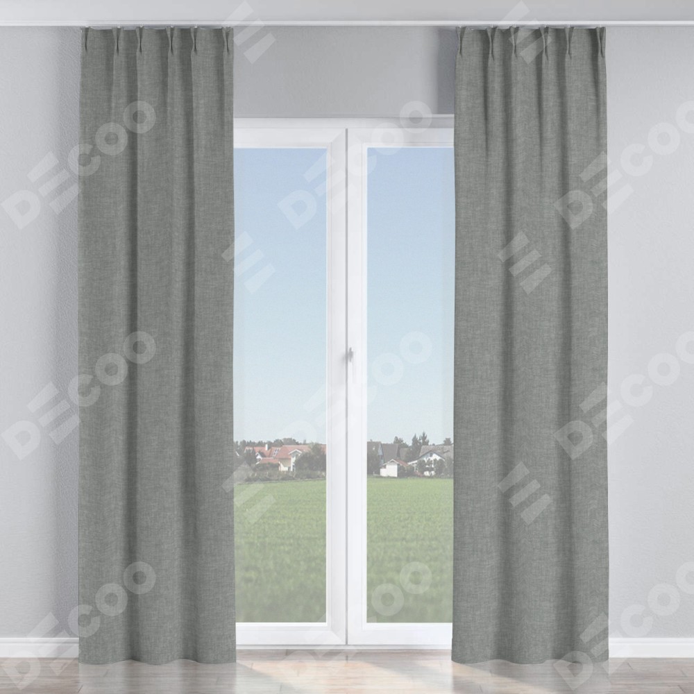 Комплект прямых штор, от производителя «Cortin», пошиты из ткани рогожка димаут тёмно-серый, артикул ткани 80418. С изнаночной стороны в верхней части штор пристрачивается шторная лента с декоративными складками «Кустик». Для создания элегантных складок прямые шторы шьются по стандарту с коэффициентом 1:2 (на 100 см. ширины проёма 200 см. ширины ткани).