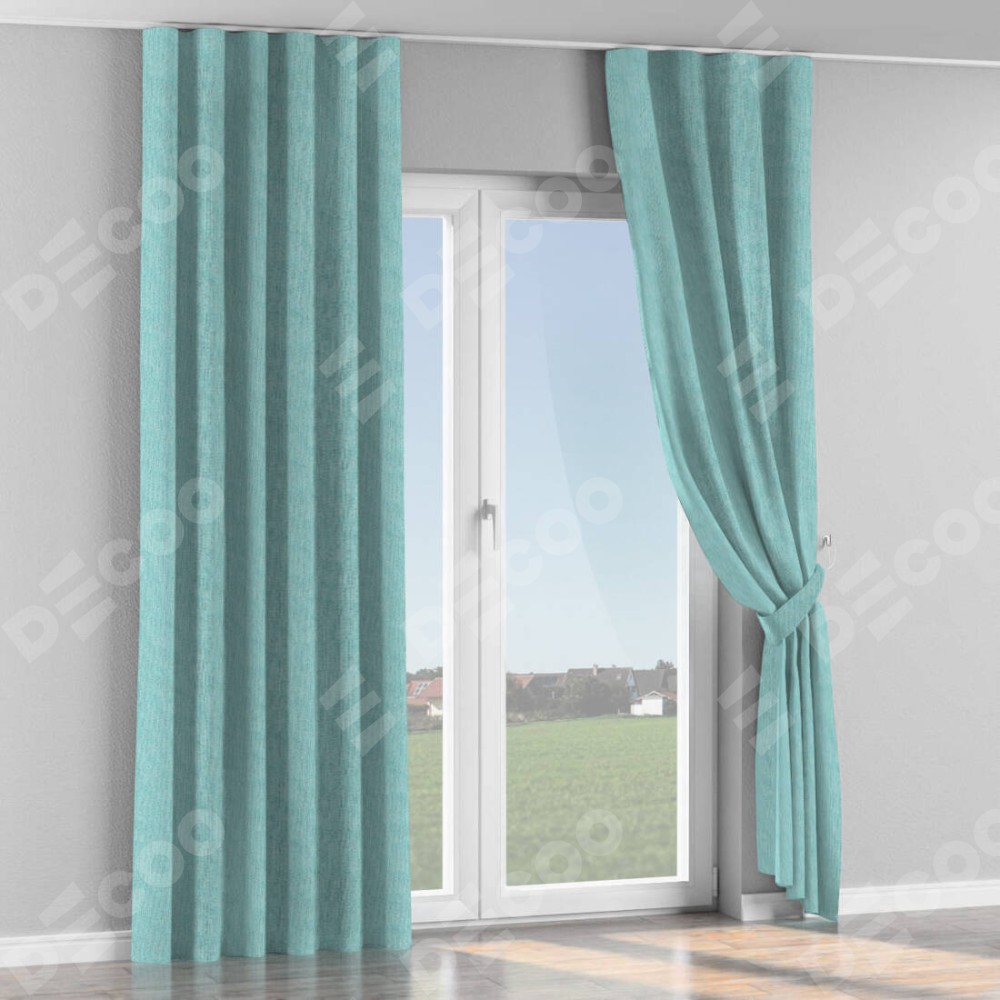 Комплект прямых штор, от производителя «Cortin», пошиты из ткани лён димаут бирюзовый, артикул ткани 23. С изнаночной стороны в верхней части штор пристрачивается шторная лента с декоративными складками «Волна». Для создания элегантных складок прямые шторы шьются по стандарту с коэффициентом 1:2 (на 100 см. ширины проёма 200 см. ширины ткани).
