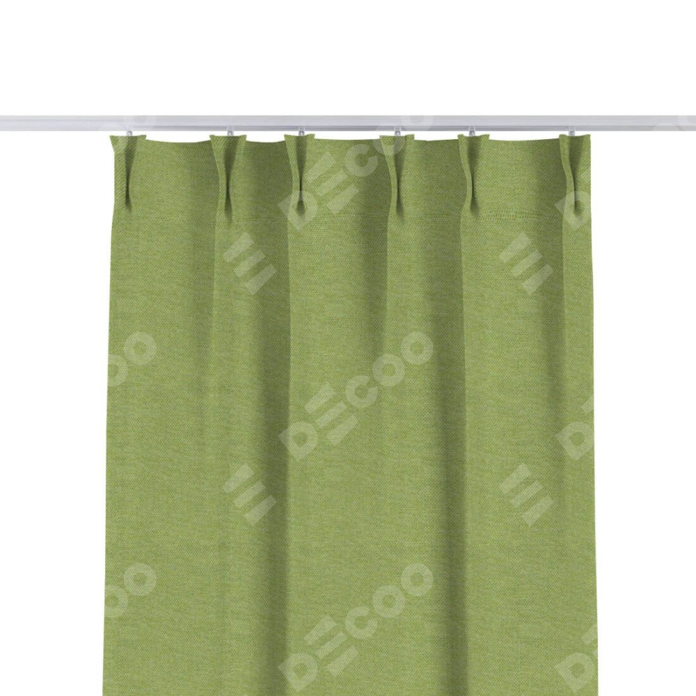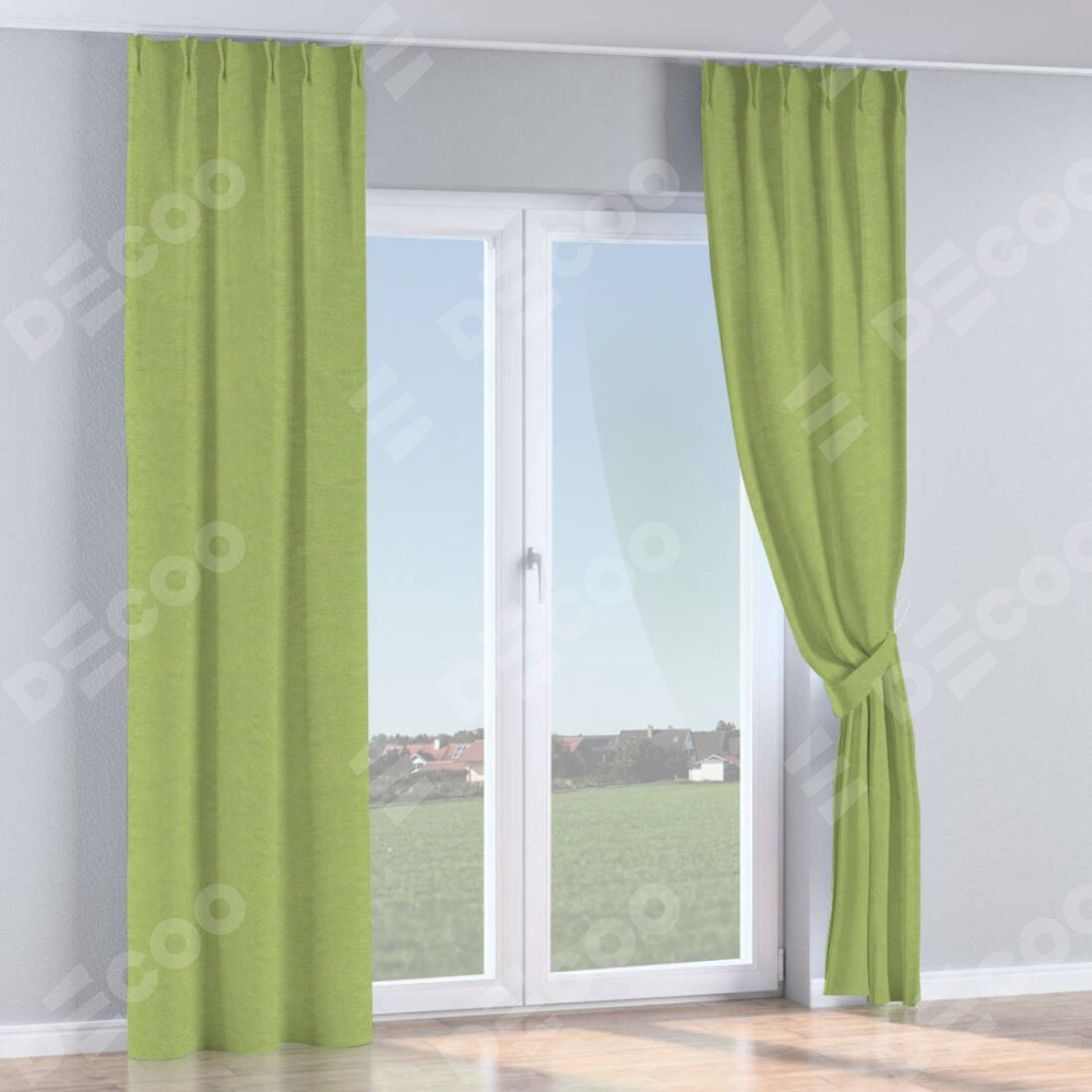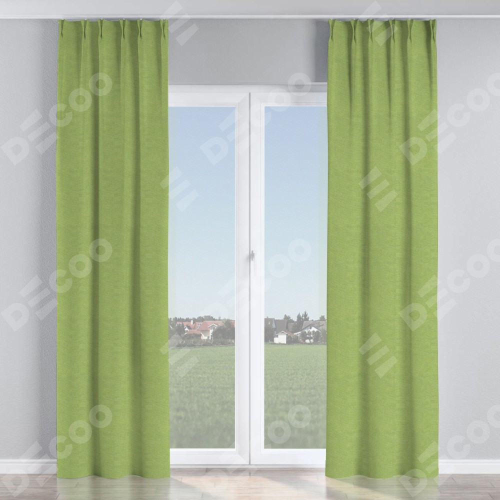 Комплект прямых штор, от производителя «Cortin», пошиты из ткани лён димаут салатовый, артикул ткани 83032. С изнаночной стороны в верхней части штор пристрачивается шторная лента с декоративными складками «Кустик». Для создания элегантных складок прямые шторы шьются по стандарту с коэффициентом 1:2 (на 100 см. ширины проёма 200 см. ширины ткани).