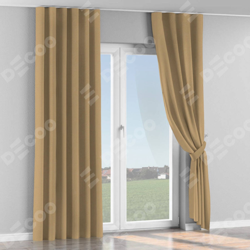 Комплект прямых штор, от производителя «Cortin», пошиты из ткани лён димаут тёмно-бежевый, артикул ткани 83037. С изнаночной стороны в верхней части штор пристрачивается шторная лента с декоративными складками «Волна». Для создания элегантных складок прямые шторы шьются по стандарту с коэффициентом 1:2 (на 100 см. ширины проёма 200 см. ширины ткани).
