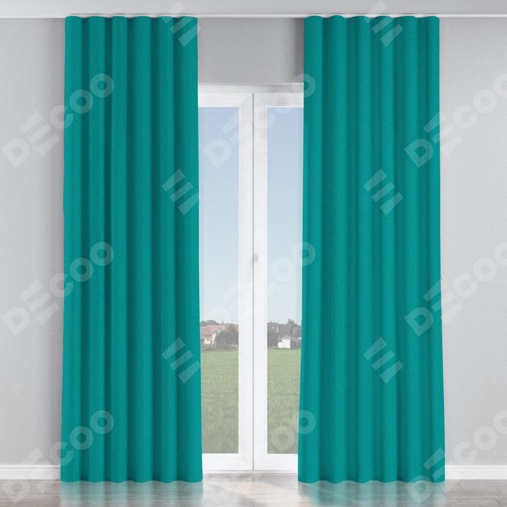 Комплект прямых штор, от производителя «Cortin», пошиты из ткани лён димаут тёмно-бирюзовый, артикул ткани 318. С изнаночной стороны в верхней части штор пристрачивается шторная лента с декоративными складками «Волна». Для создания элегантных складок прямые шторы шьются по стандарту с коэффициентом 1:2 (на 100 см. ширины проёма 200 см. ширины ткани).