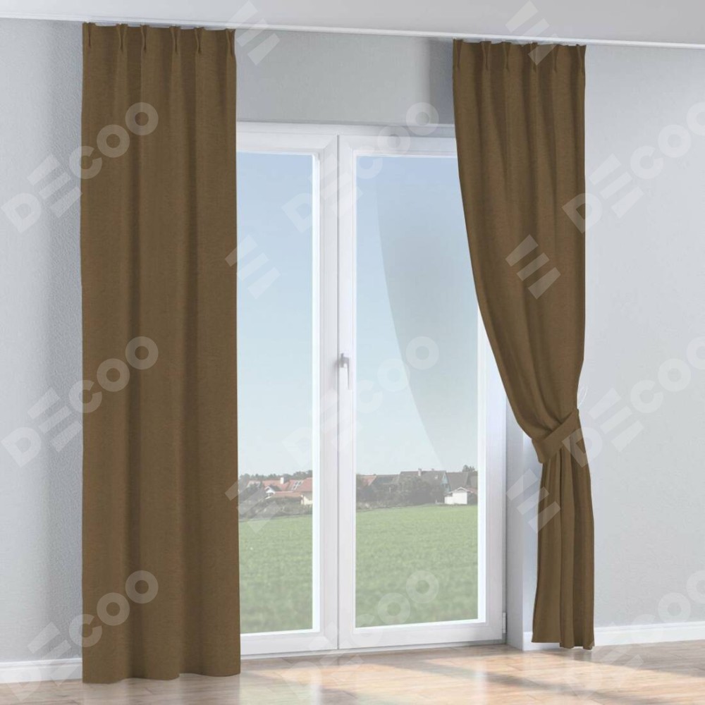Комплект прямых штор, от производителя «Cortin», пошиты из ткани лён димаут тёмно-коричневый, артикул ткани 83030. С изнаночной стороны в верхней части штор пристрачивается шторная лента с декоративными складками «Кустик». Для создания элегантных складок прямые шторы шьются по стандарту с коэффициентом 1:2 (на 100 см. ширины проёма 200 см. ширины ткани).