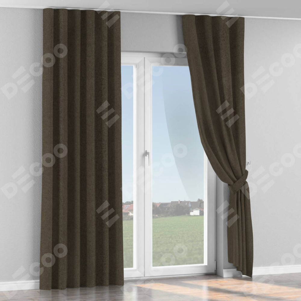 Комплект прямых штор, от производителя «Cortin», пошиты из ткани твид блэкаут тёмно-коричневый, артикул ткани 21584. С изнаночной стороны в верхней части штор пристрачивается шторная лента с декоративными складками «Волна». Для создания элегантных складок прямые шторы шьются по стандарту с коэффициентом 1:2 (на 100 см. ширины проёма 200 см. ширины ткани).