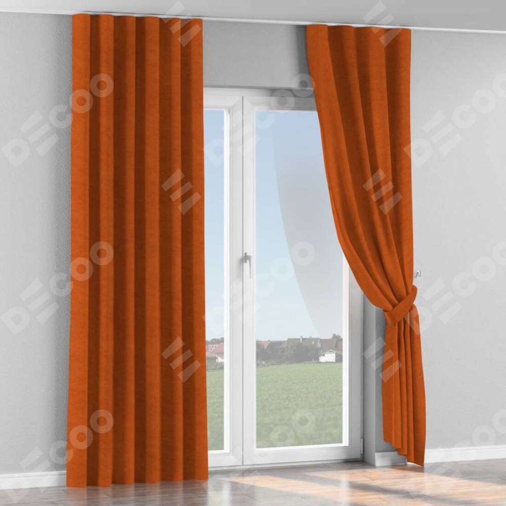 Комплект прямых штор, от производителя «Cortin», пошиты из ткани вельвет терракотовый, артикул ткани 85548. С изнаночной стороны в верхней части штор пристрачивается шторная лента с декоративными складками «Волна». Для создания элегантных складок прямые шторы шьются по стандарту с коэффициентом 1:2 (на 100 см. ширины проёма 200 см. ширины ткани).