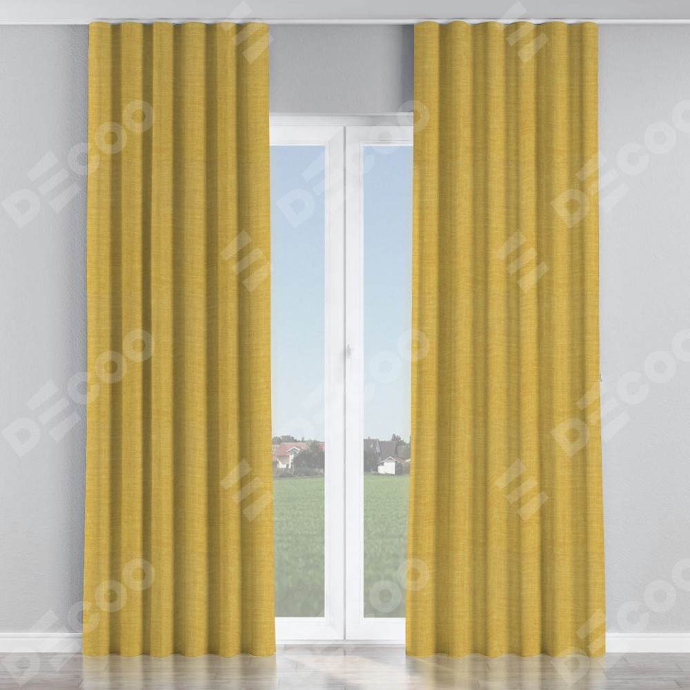 Комплект прямых штор, от производителя «Cortin», пошиты из ткани лён горчичный, артикул ткани 74740. С изнаночной стороны в верхней части штор пристрачивается шторная лента с декоративными складками «Волна». Для создания элегантных складок прямые шторы шьются по стандарту с коэффициентом 1:2 (на 100 см. ширины проёма 200 см. ширины ткани).
