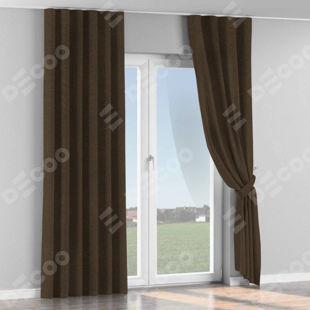 Комплект прямых штор, от производителя «Cortin», пошиты из ткани лён тёмно-коричневый, артикул ткани 53444. С изнаночной стороны в верхней части штор пристрачивается шторная лента с декоративными складками «Волна». Для создания элегантных складок прямые шторы шьются по стандарту с коэффициентом 1:2 (на 100 см. ширины проёма 200 см. ширины ткани).