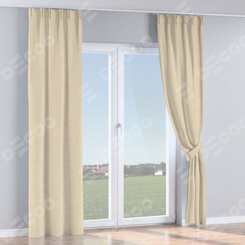 Комплект прямых штор, от производителя «Cortin», пошиты из ткани лён кашемир шампань, артикул ткани 17205. С изнаночной стороны в верхней части штор пристрачивается шторная лента с декоративными складками «Кустик». Для создания элегантных складок прямые шторы шьются по стандарту с коэффициентом 1:2 (на 100 см. ширины проёма 200 см. ширины ткани).