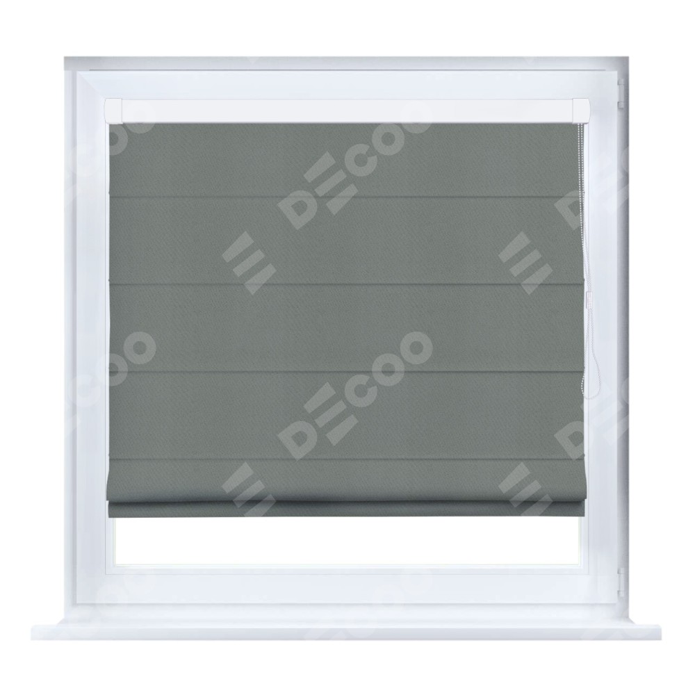 Римская штора кассетного типа, производителя «Cortin», устанавливается только на пластиковые окна и прилегает к стеклопакету, пошита из ткани блэкаут однотонный тёмно-серый, артикул 18077.