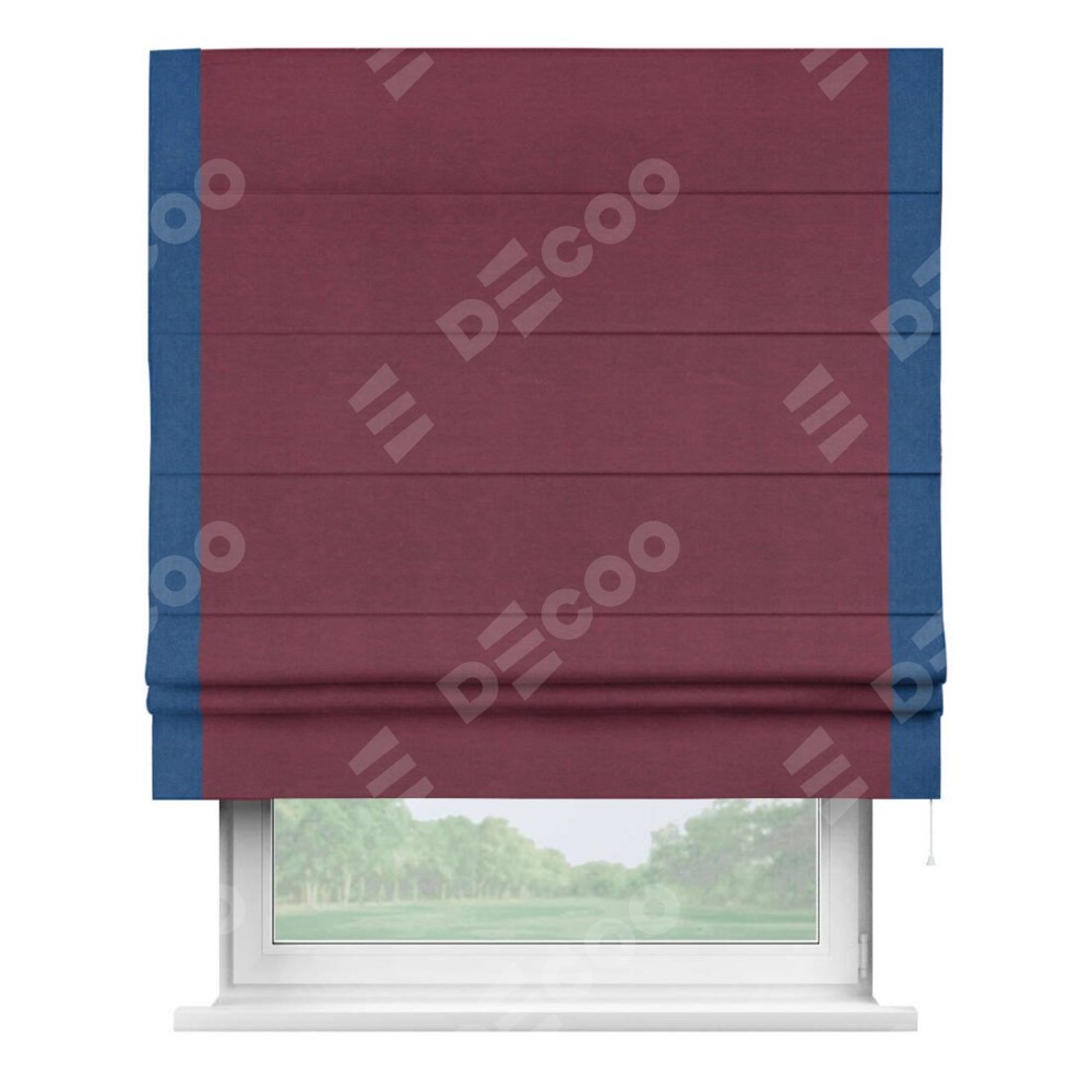 Римская штора производителя «Cortin», используется для проёма, пошита из ткани вельвет бордовый, артикул ткани 85553. Отделка шторы кантом «Стрим Дуо», ткань для канта используется из вельвета разной расцветки на выбор. Имеет универсальный механизм и подходит для монтажа: на потолок, на стену и в нишу.