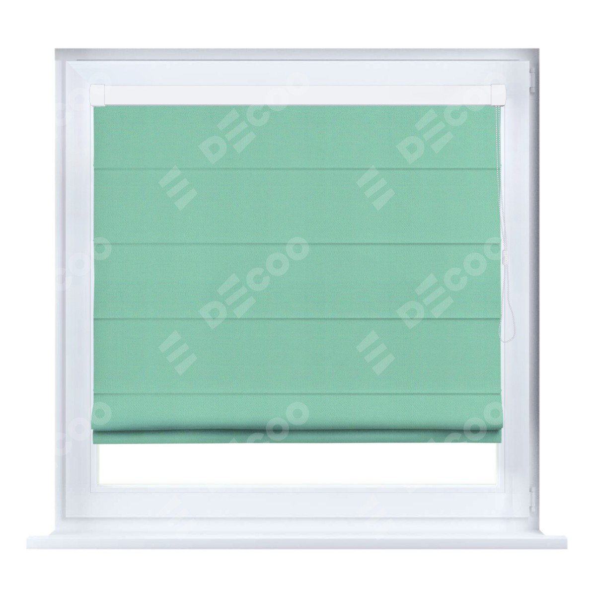 Римская штора кассетного типа, производителя «Cortin», устанавливается только на пластиковые окна и прилегает к стеклопакету, пошита из ткани pipa блэкаут бирюза, артикул 81852.