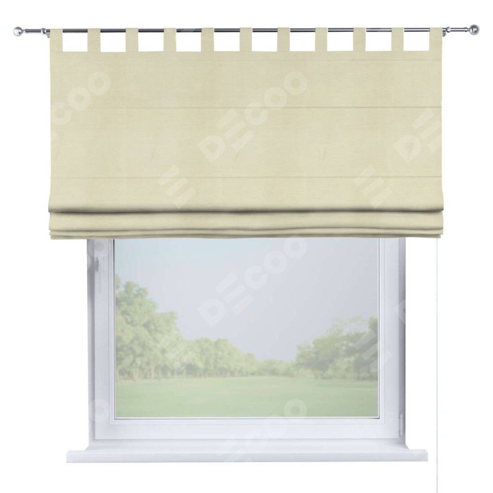 Римская штора производителя «Cortin», используется для проёма, пошита из ткани бархат молочный, артикул ткани 21409. Данная модель пошита на петлях, комплектуется на выбор круглым карнизом и подходит для монтажа на стену. Римская штора на петлях имеет простую систему регулировки высоты, отличительным преимуществом данной модели является простой способ монтажа. Достаточно повесить ее на трубу и штора готова!