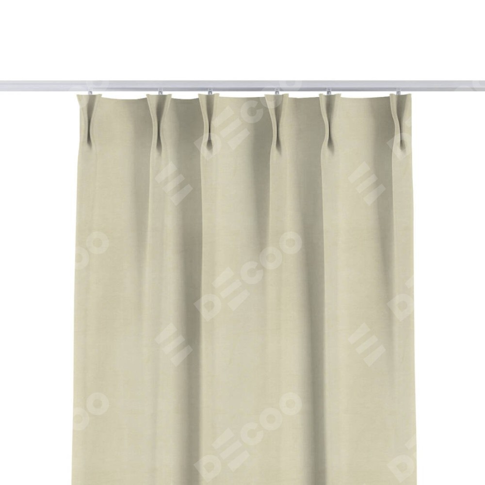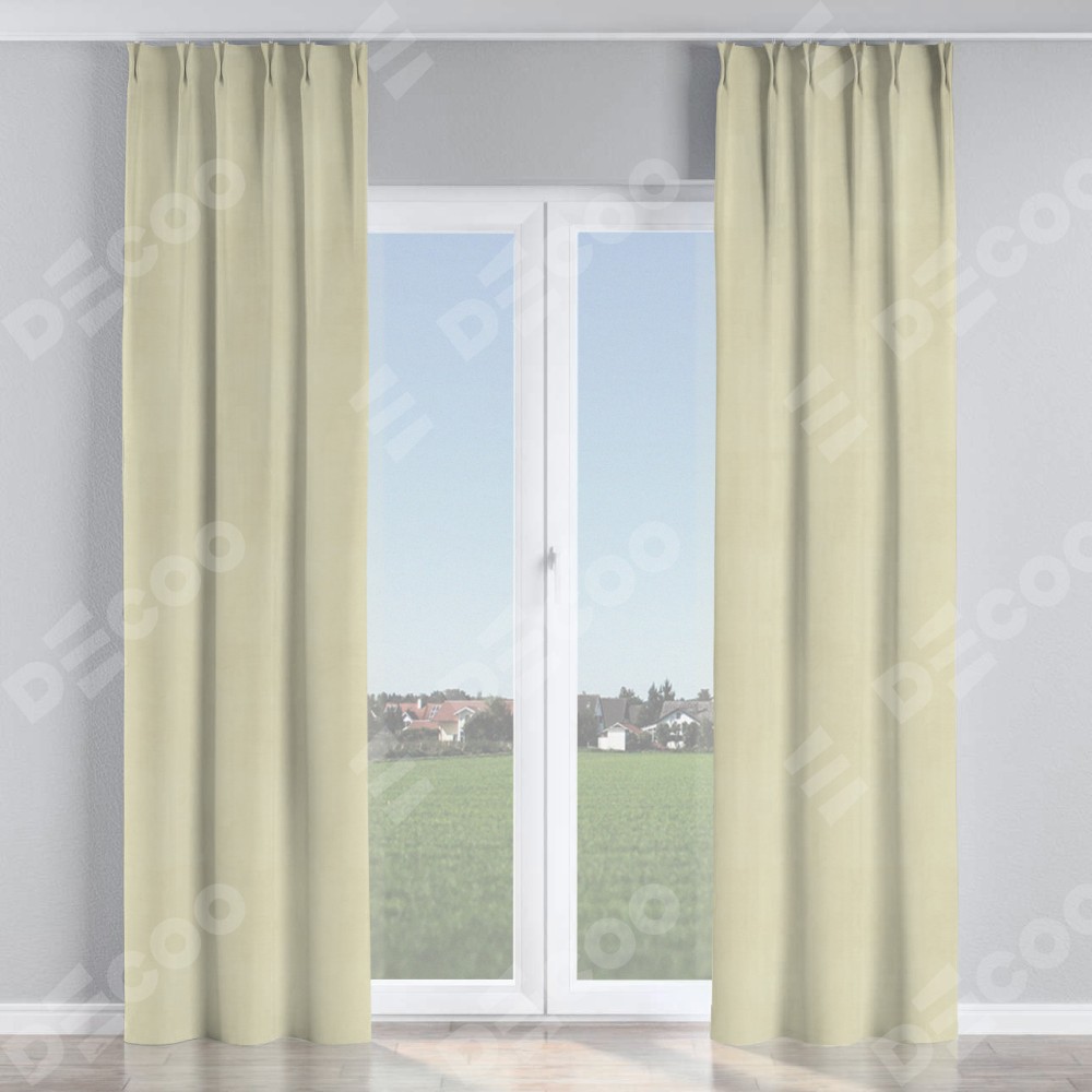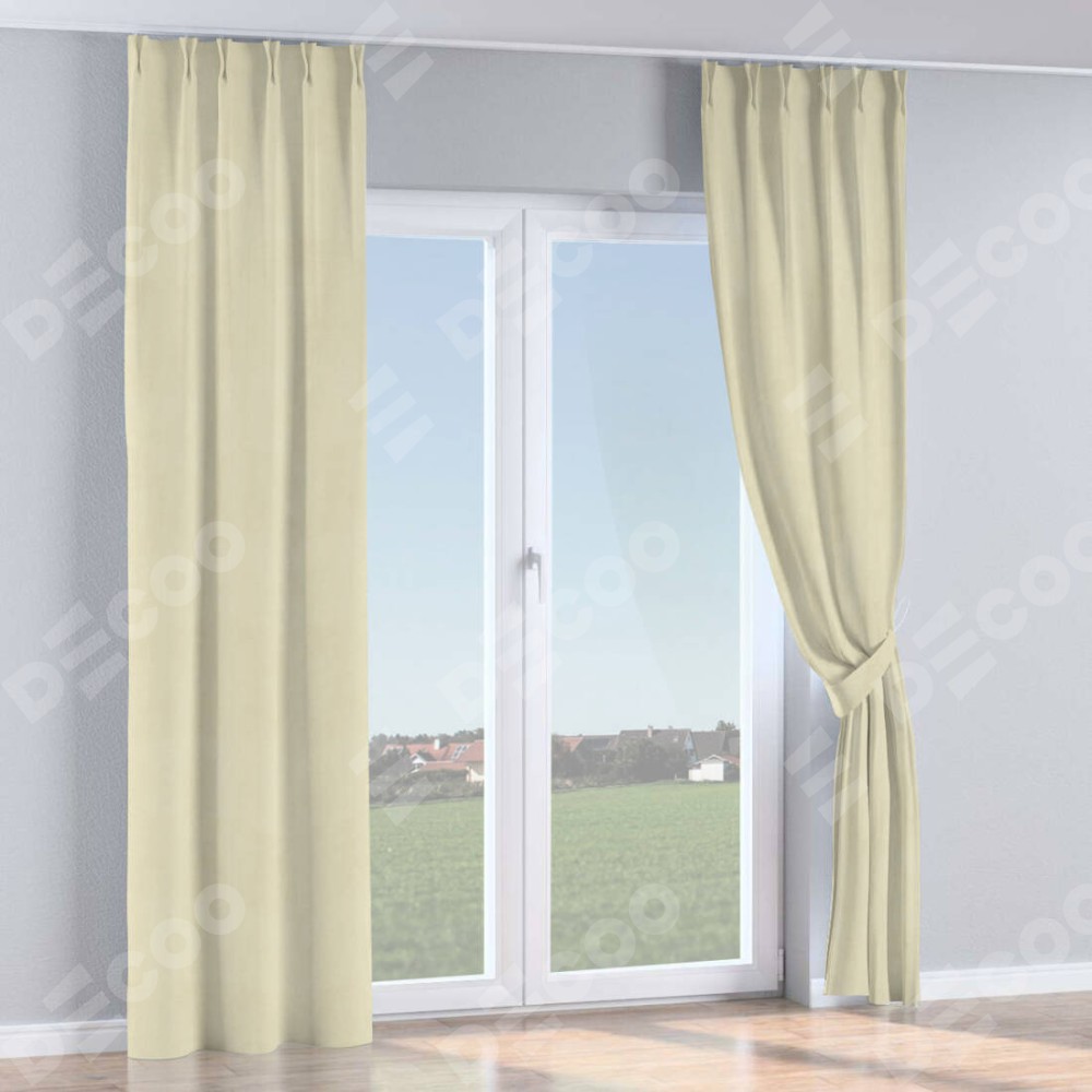Комплект прямых штор, от производителя «Cortin», пошиты из ткани бархат молочный, артикул ткани 21409. С изнаночной стороны в верхней части штор пристрачивается шторная лента с декоративными складками «Кустик». Для создания элегантных складок прямые шторы шьются по стандарту с коэффициентом 1:2 (на 100 см. ширины проёма 200 см. ширины ткани).