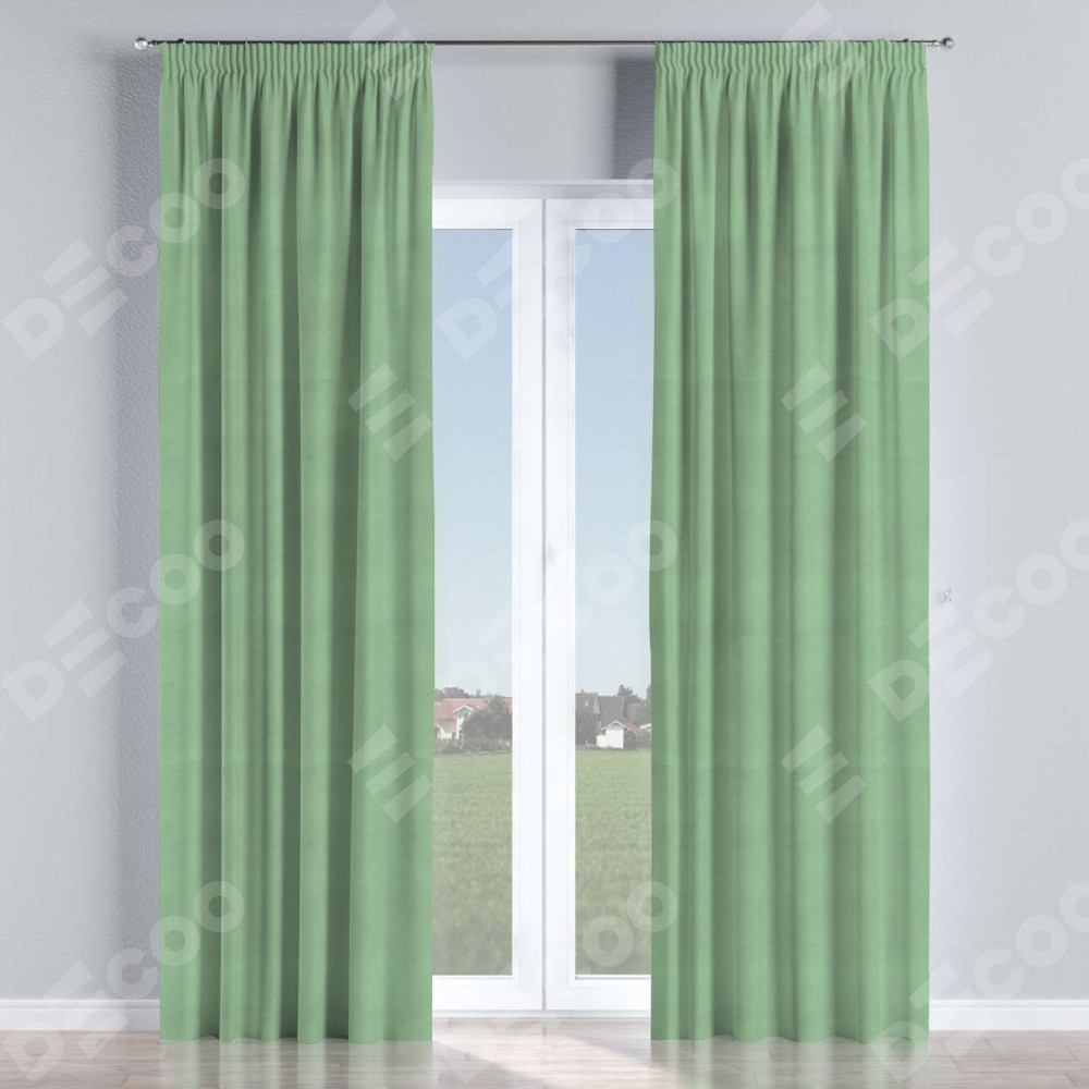 Комплект прямых штор, от производителя «Cortin», пошиты из ткани бархат оливковый, артикул ткани 18746. С изнаночной стороны в верхней части штор пристрачивается шторная лента с декоративными складками «Карандаш». Для создания элегантных складок прямые шторы шьются по стандарту с коэффициентом 1:2 (на 100 см. ширины проёма 200 см. ширины ткани).