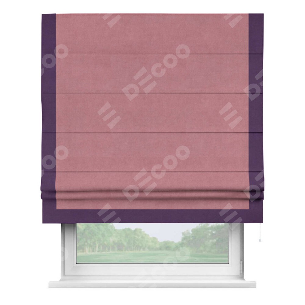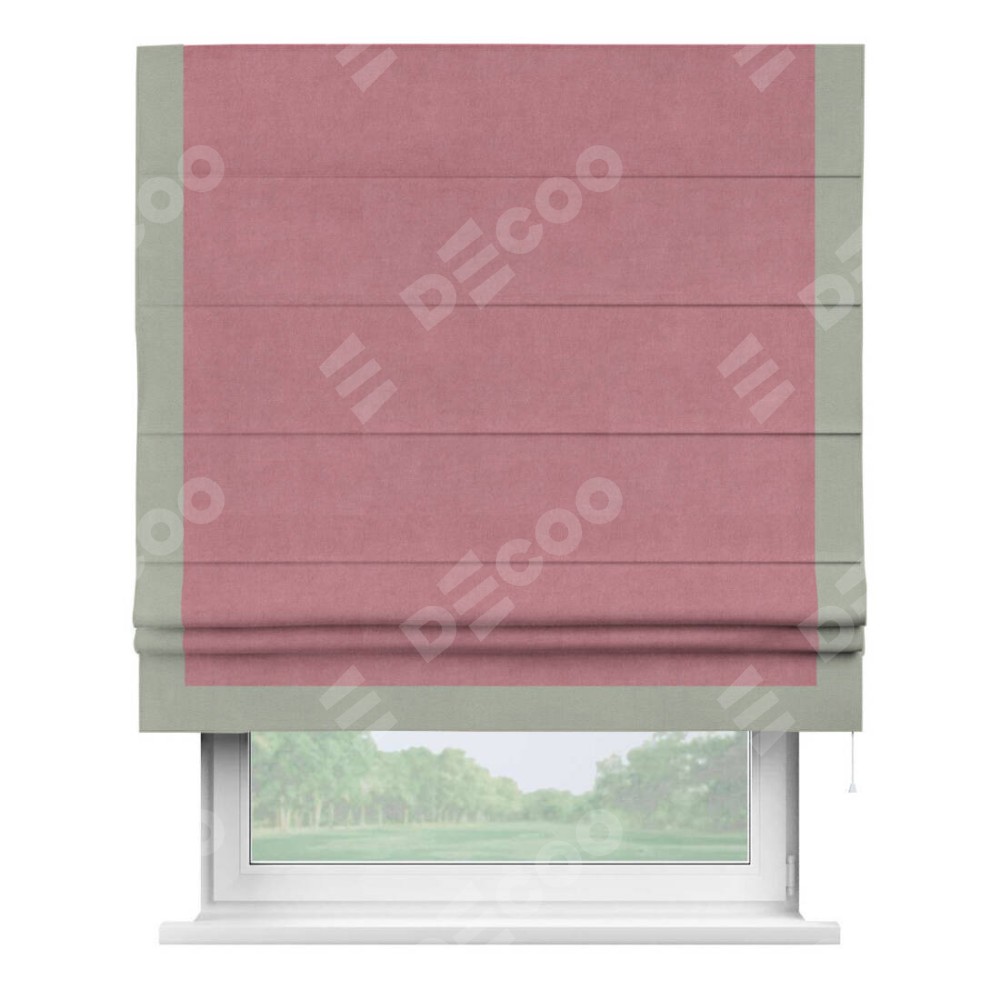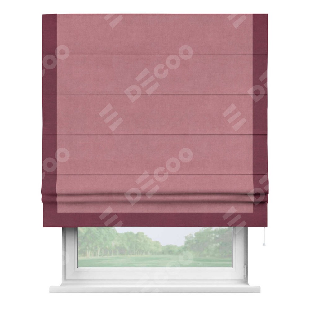 Римская штора производителя «Cortin», используется для проёма, пошита из ткани вельвет брусника, артикул ткани 85550. Отделка шторы кантом «Виктория», ткань для канта используется из вельвета разной расцветки на выбор. Имеет универсальный механизм и подходит для монтажа: на потолок, на стену и в нишу.