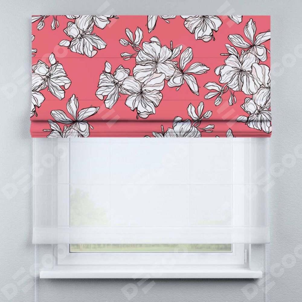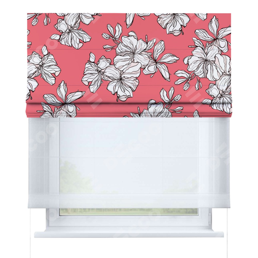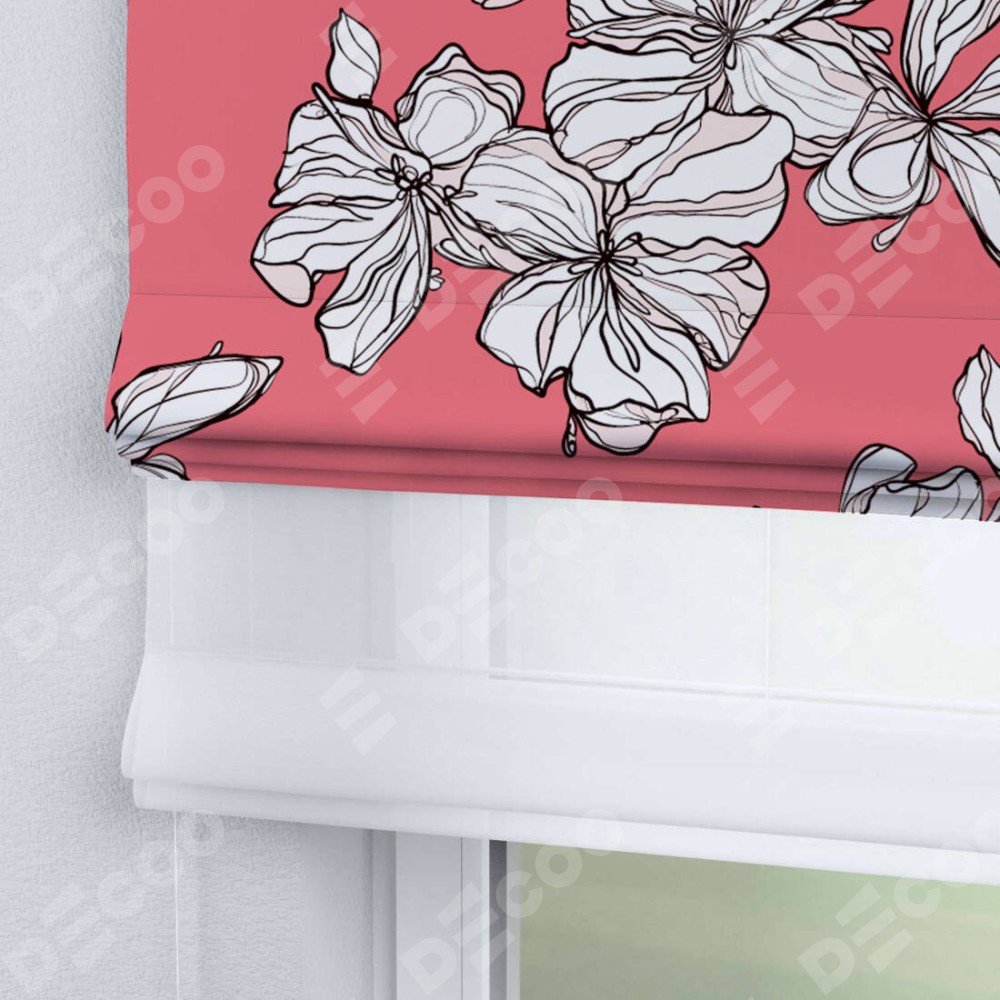 Римская штора день-ночь производителя «Cortin», используется для проёма, пошита из двух полотен, с лицевой блэкаут с нанесением сублимационной печати «Белые цветы», вторая ткань тюль (по стандарту комплектуется тюль белого цвета артикул V-01). Имеет универсальный механизм и подходит для монтажа: на потолок, на стену и в нишу.